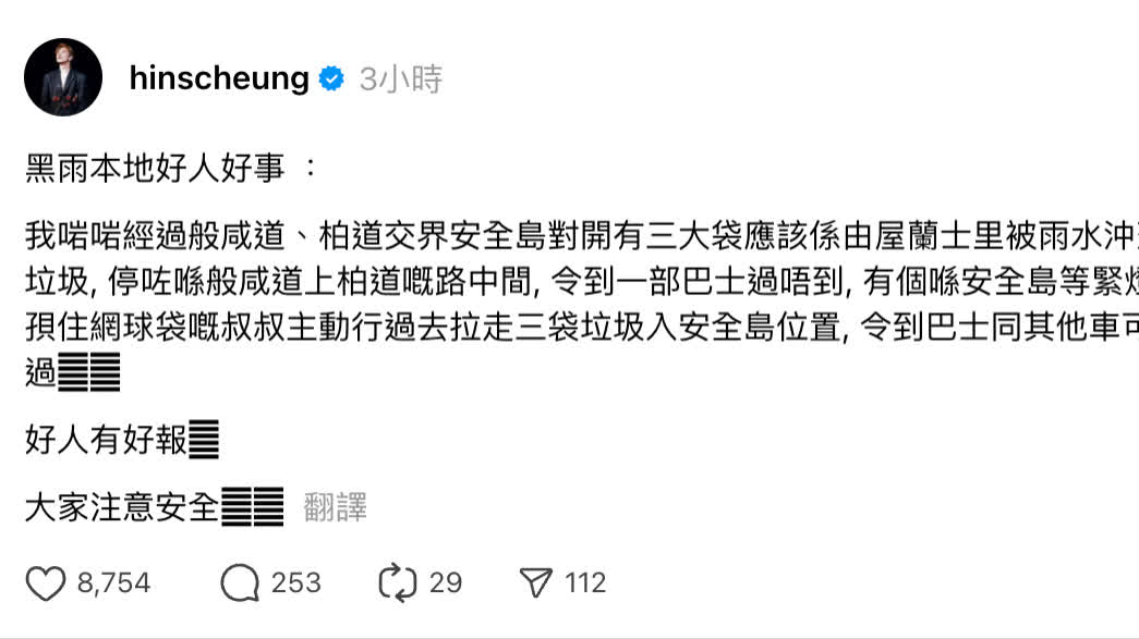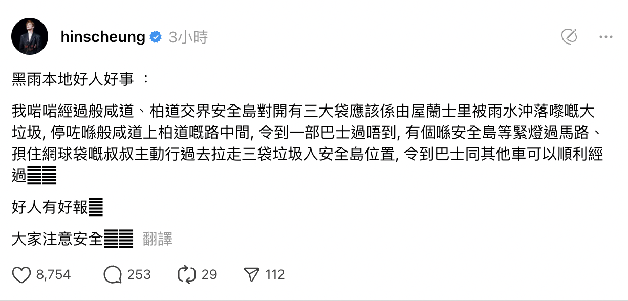張敬軒發文:「我啱啱經過般咸道、柏道交界安全島對開有三大袋應該係由屋蘭士里被雨水沖落嚟嘅大垃圾,停咗喺般咸道上柏道嘅路中間,令到一部巴士過唔到,有個喺安全島等緊燈過馬路、孭住網球袋嘅叔叔主動行過去拉走三袋垃圾入安全島位置,令到巴士同其他車可以順利經過。好人有好報。」