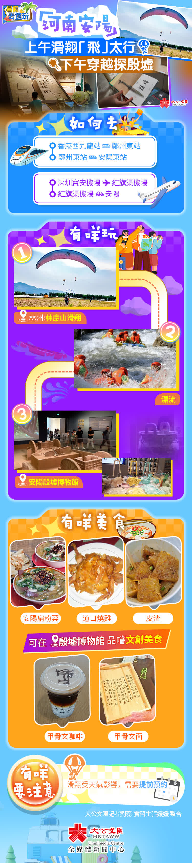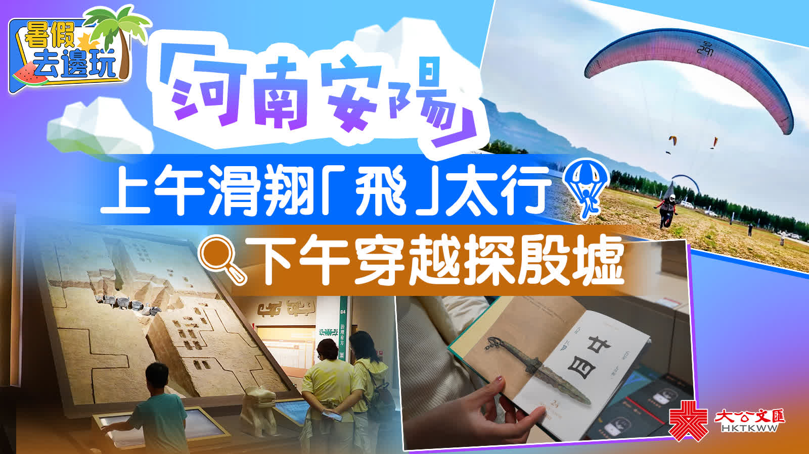 (大公文匯網記者 劉蕊 實習生 張媛媛)「是自由的感覺,特別棒!」來自鄭州的張女士乘滑翔傘落地時難掩興奮,「這是我第二次滑翔,這次特意帶女兒來體驗。」香港爸媽暑假還在發愁帶娃去哪兒?不妨像張女士這樣,帶孩子來河南安陽來趟「雙飛」之旅——上午在林州化身「小鷹」,於千米高空俯瞰太行;下午變身「考古學家」,在殷墟穿越三千年觸摸文明。一天之內兩次「起飛」,既能讓小朋友玩到電量清零,又能讓大人愜意消暑,更能讓歷史課本在眼前「自動更新」!