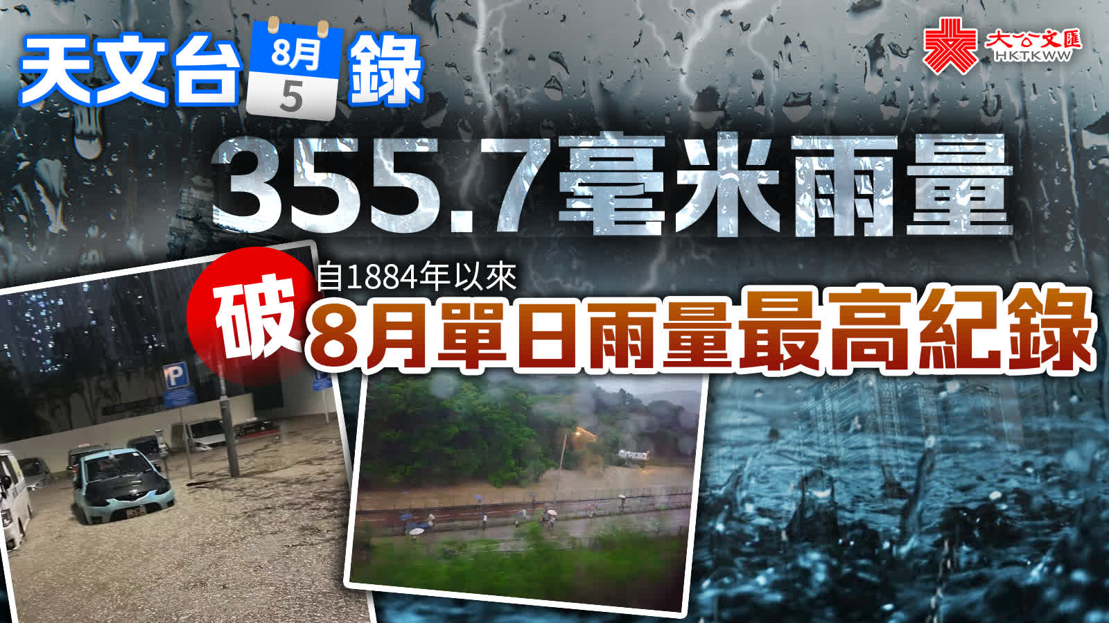 截至下午2時,今日天文台總部已錄得355.7毫米雨量,打破了自1884年以來8月份單日雨量最高紀錄。