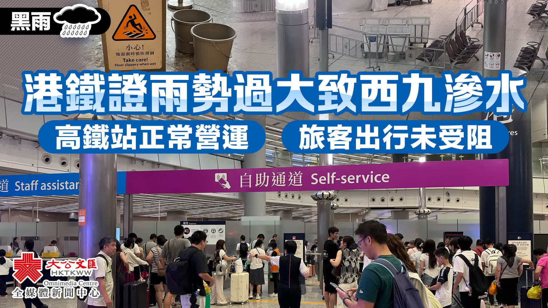 關於此前有市民目擊西九龍高鐵站內疑似漏水情況,大公文匯全媒體記者向港鐵查詢獲得回覆指,「今早約9時許黑色暴雨期間,香港西九龍站B3層近天幕廣場位置有滲水情況,相信是因為雨勢太大,雨水一時未能疏導,後經維修人員檢視並疏導積聚的雨水,車站職員亦在場協助,避免乘客進入該範圍,期間車站維持正常服務。」