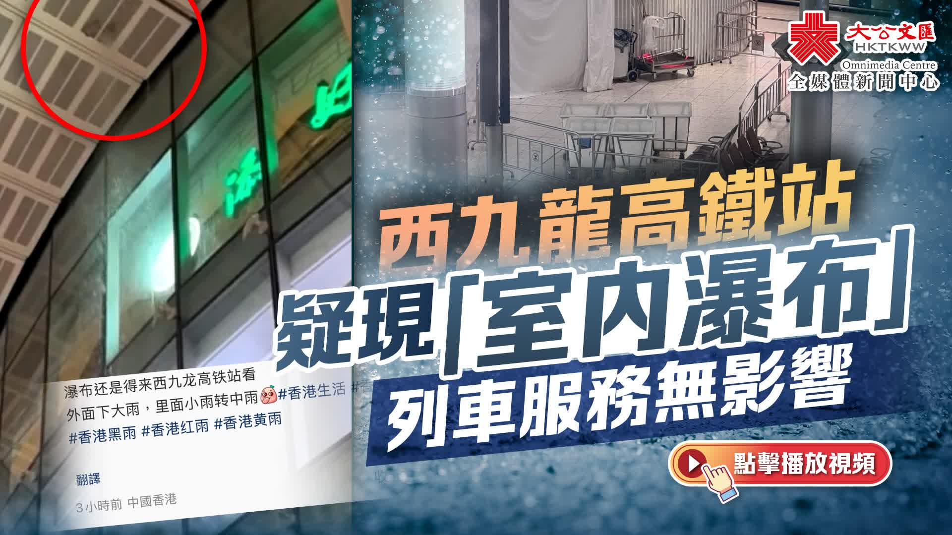 港鐵回覆大公文匯全媒體指,「今早約9時許黑色暴雨期間,香港西九龍站B3層近天幕廣場位置有滲水情況,相信是因為雨勢太大,雨水一時未能疏導,後經維修人員檢視並疏導積聚的雨水,車站職員亦在場協助,避免乘客進入該範圍,期間,車站維持正常服務。」