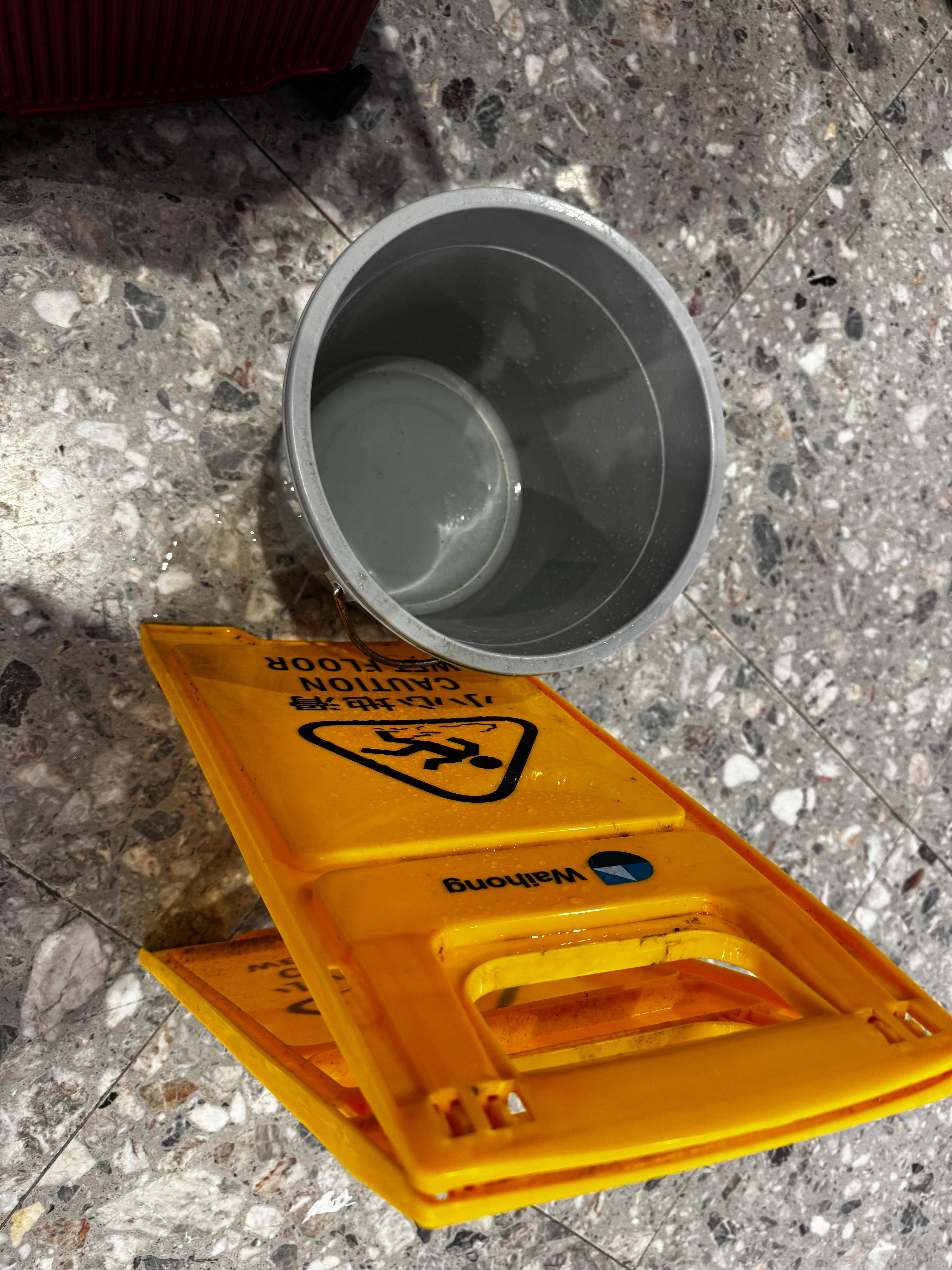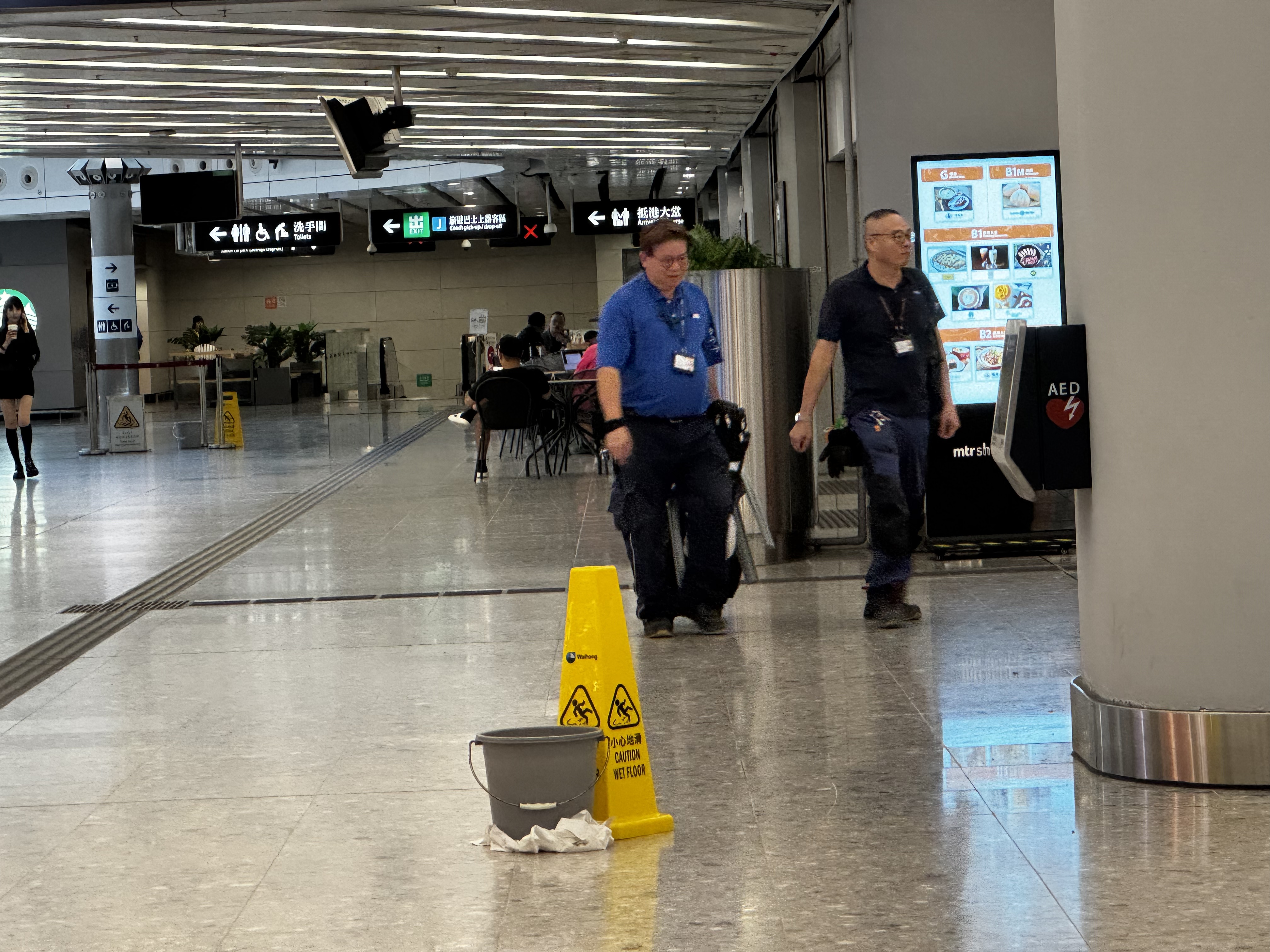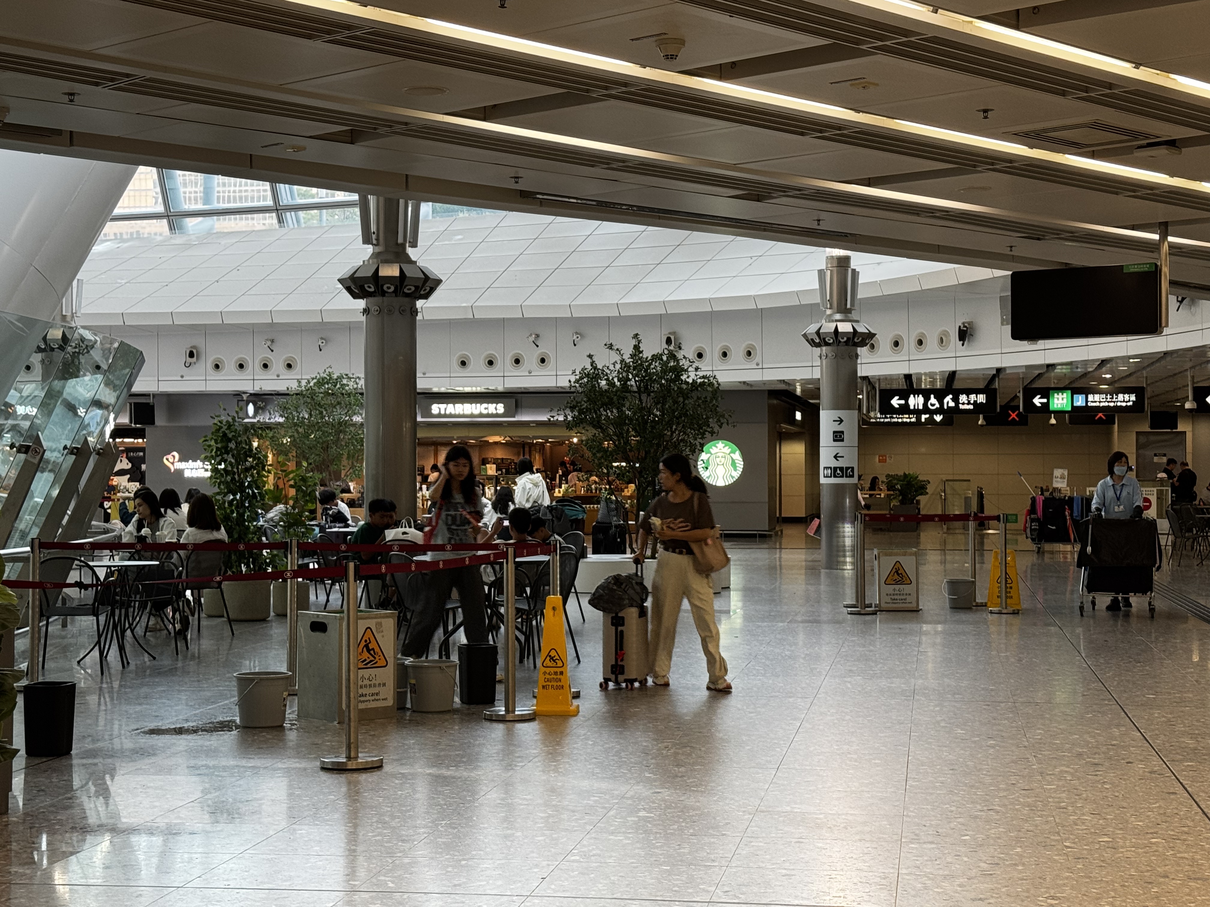 大公文匯全媒體記者下午4時許在西九龍高鐵站抵港大堂、高鐵出發層多處見到水桶及防滑提示牌設置,部分地點仍在滴水,或僅有一層薄薄的積水,不過未有影響乘客出行。有清潔人員在水桶下放置衞生紙,清潔積水。