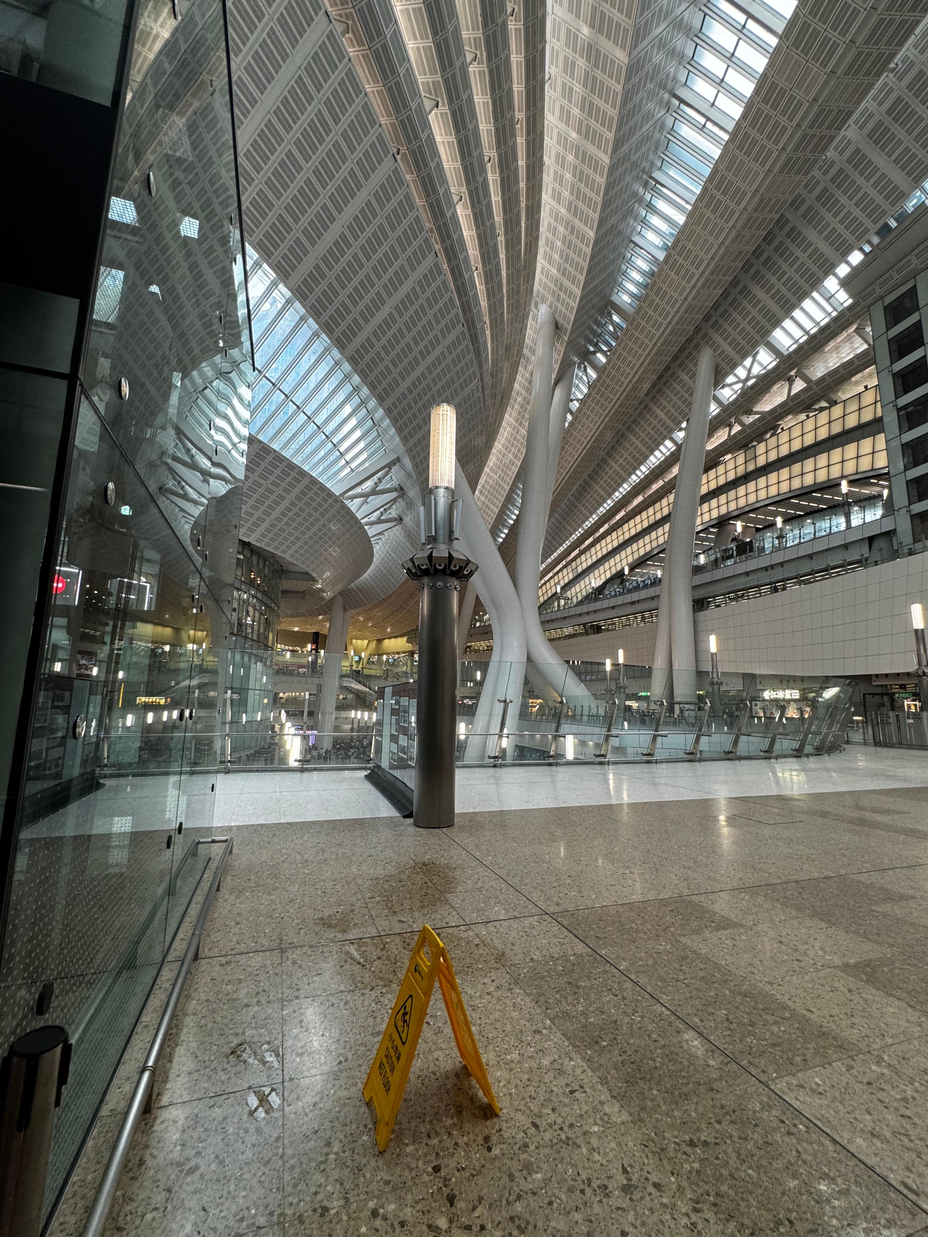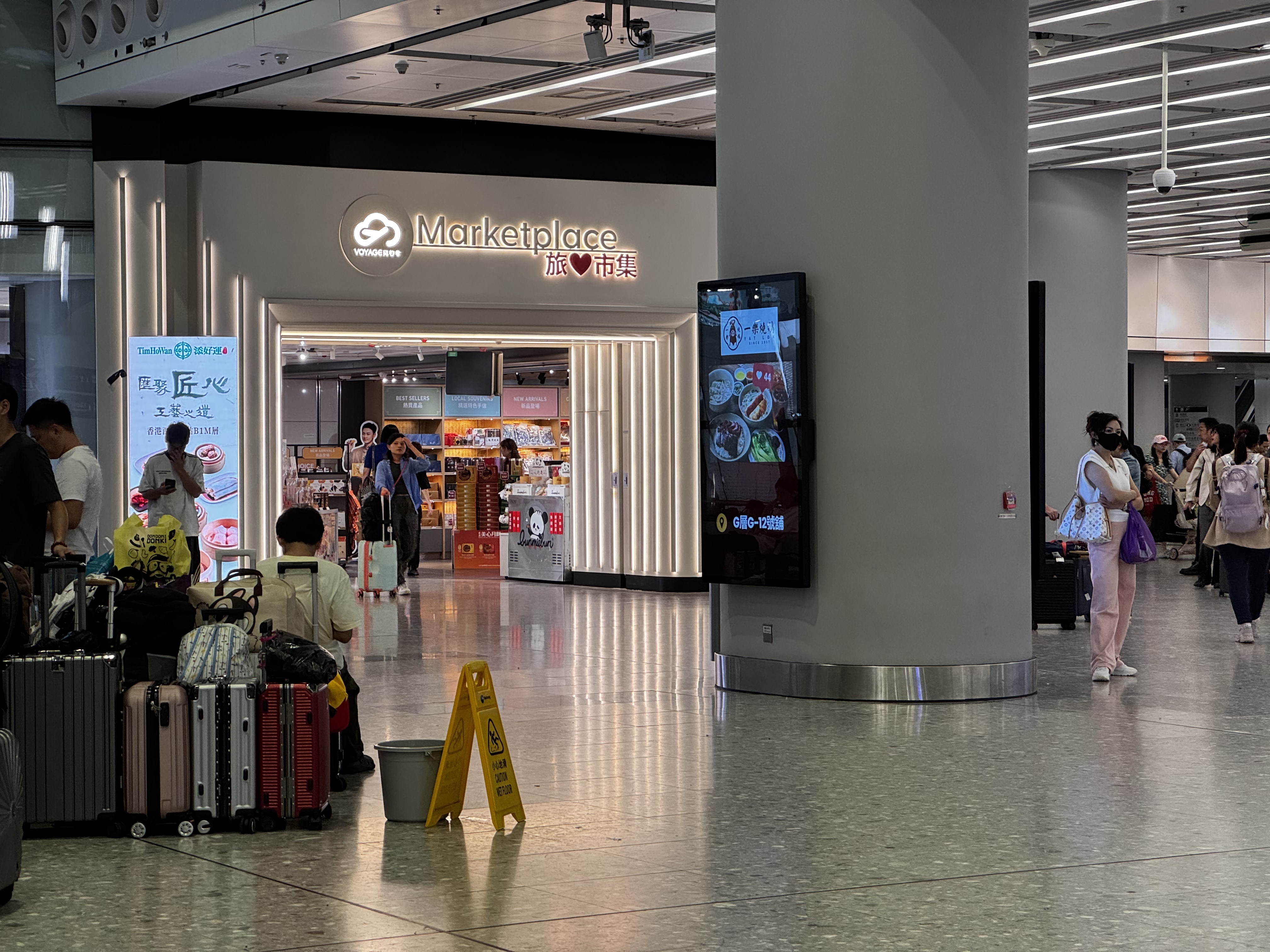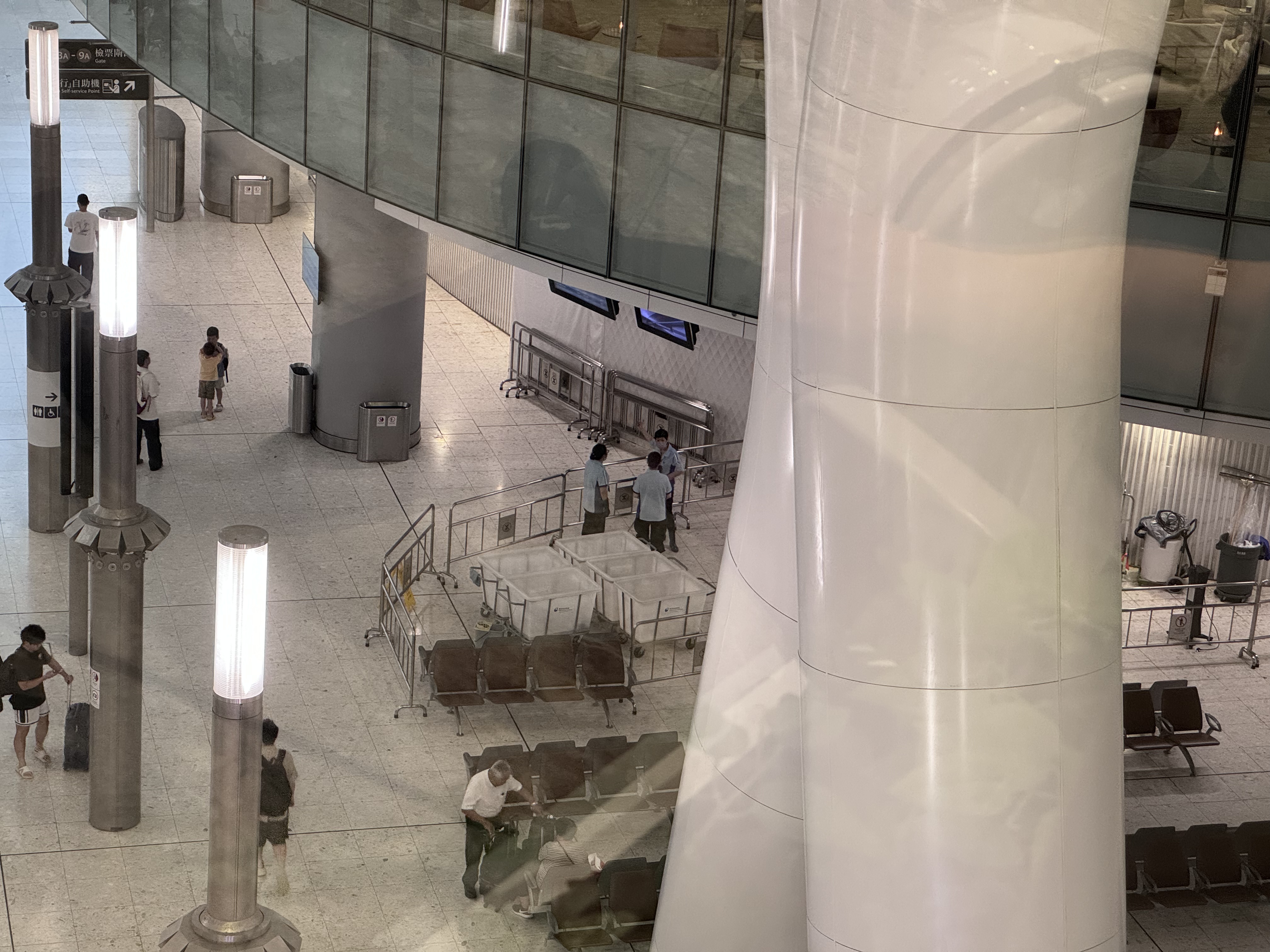 大公文匯全媒體記者下午4時許在西九龍高鐵站抵港大堂、高鐵出發層多處見到水桶及防滑提示牌設置,部分地點仍在滴水,或僅有一層薄薄的積水,不過未有影響乘客出行。有清潔人員在水桶下放置衞生紙,清潔積水。