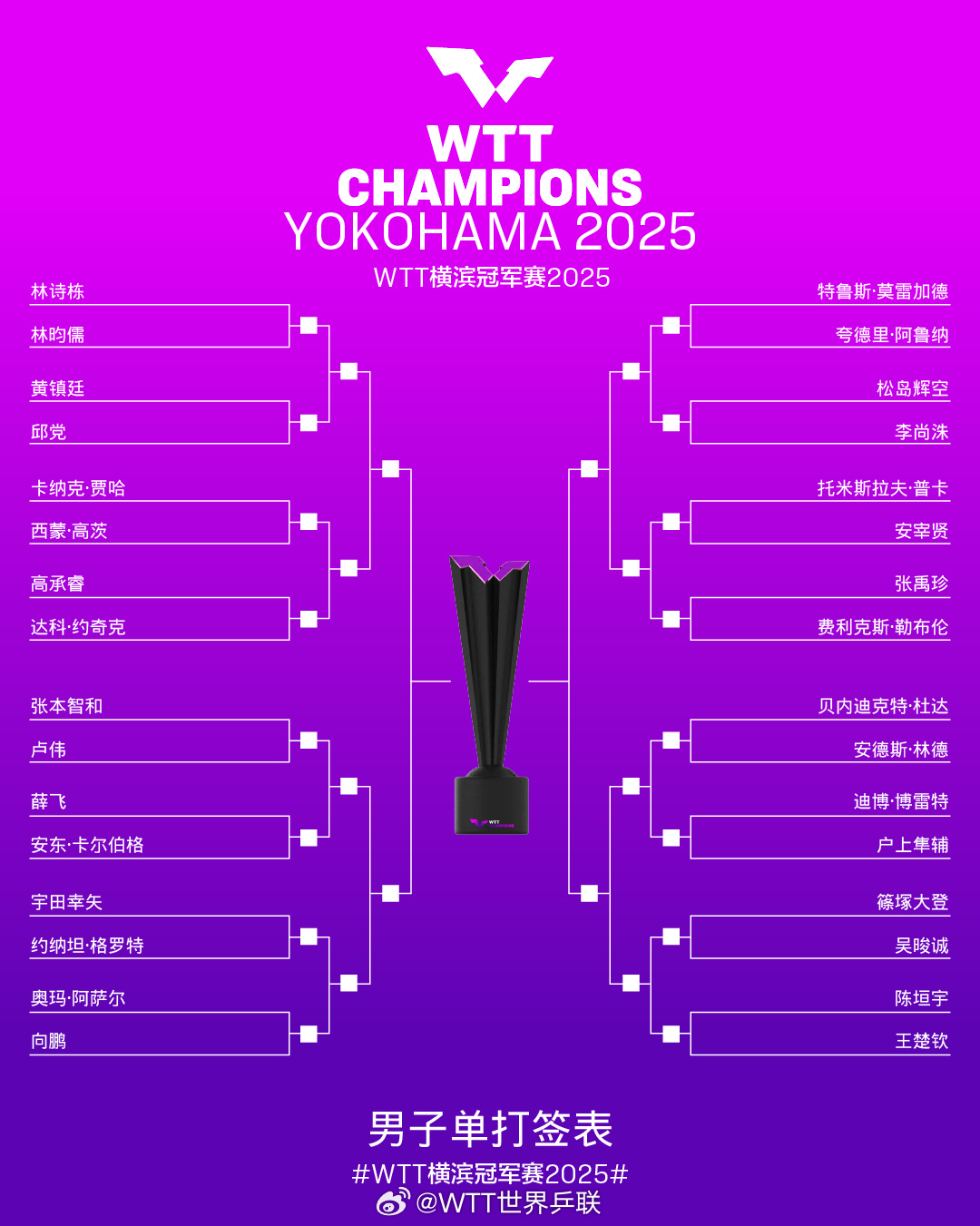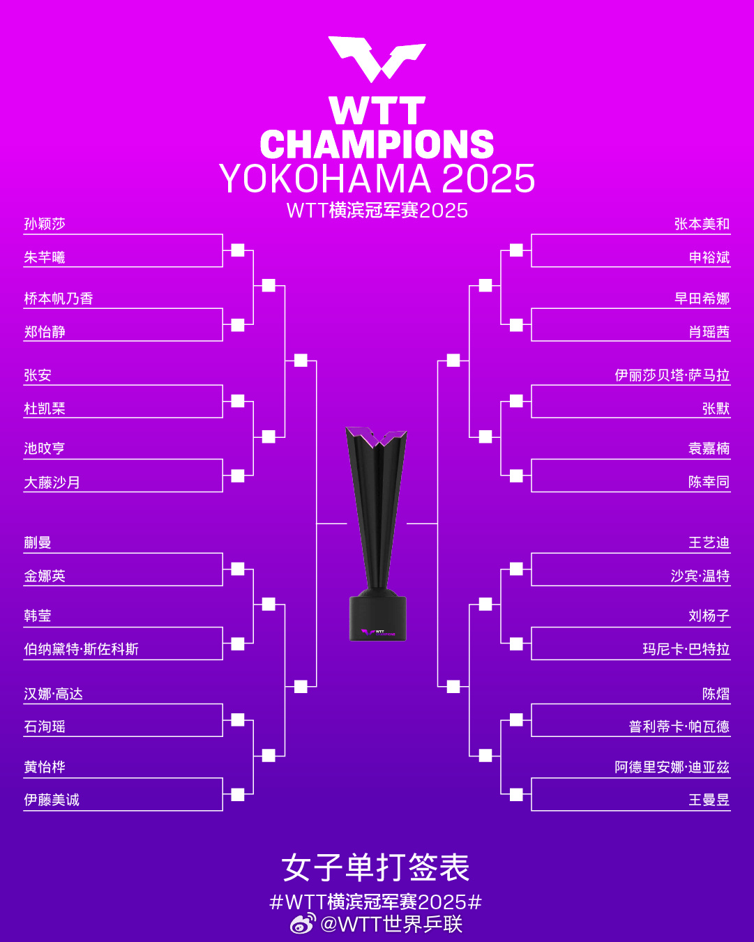 大公文匯全媒體報道,2025年WTT橫濱冠軍賽將於8月7日至11日,於日本橫濱文化體育館舉行。今日(5日),抽籤結果公布!當中,孫穎莎首場將對陣韓國選手朱芊曦。