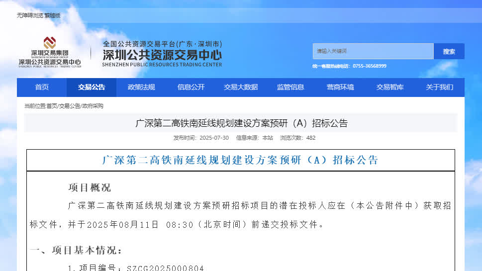 (大公文匯網 記者 郭若溪)廣深第二高鐵又有新進展。深圳公共資源交易中心公告信息顯示,近日, 深圳市發展和改革委員會正式啟動廣深第二高鐵南延線規劃建設方案預研招標。根據已披露信息,廣深第二高鐵南延線線路或與港深西部鐵路協同,進一步密切香港與內地聯繫。