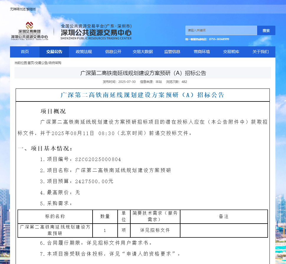 招標信息透露,廣深第二高鐵是2020年5月國家發展改革委批複的《粵港澳大灣區基礎設施互聯互通規劃》中的高速鐵路,起於深圳機場東站,經東莞中心區、白雲機場站至廣州北站,向北銜接廣清永州高鐵,形成深圳北向和至西南地區的高鐵新通道。廣深第二高鐵南延線由機場東站往南引出,初步路由途經寶安、前海、南山至香港北部都會區、明日大嶼都會區,是支撐香港進一步融入國家發展大局的重要研究項目。