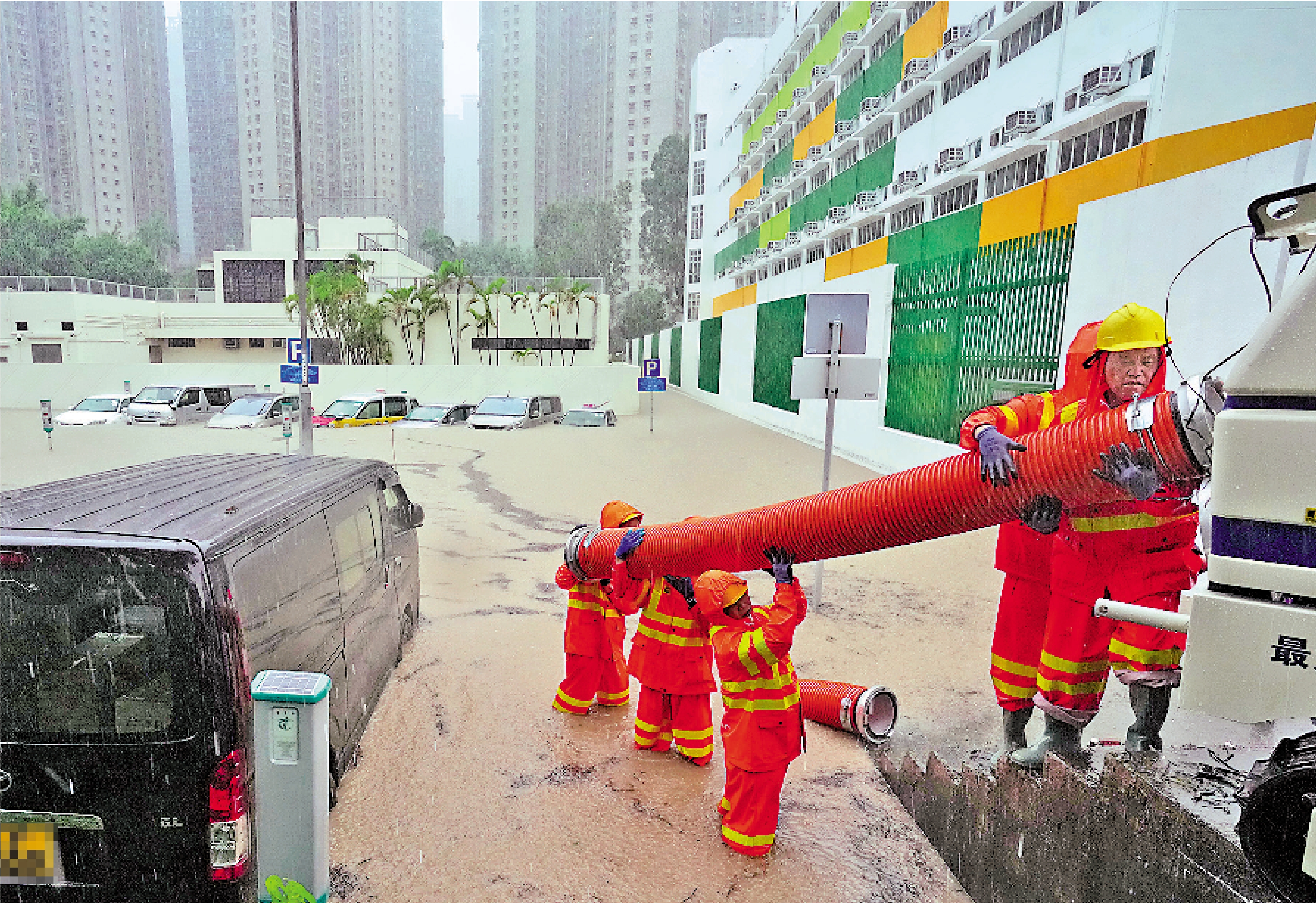 將軍澳雨量最大,險情處處。敬賢里露天咪錶停車場自昨日凌晨起,洪水沿山路灌入停車場,出現嚴重水浸,八輛汽車浸在水深過腰的泥水中,有私家車幾近沒頂。渠務署通宵出動協助疏通渠道,派出強力排水機械人排走積水。有受害車主表示,今次大雨是過去幾年前所未見最嚴重的,比前年還厲害。記者所見,現場有十多名渠務工人不斷埋頭苦幹疏通,中午只以麵包充飢。