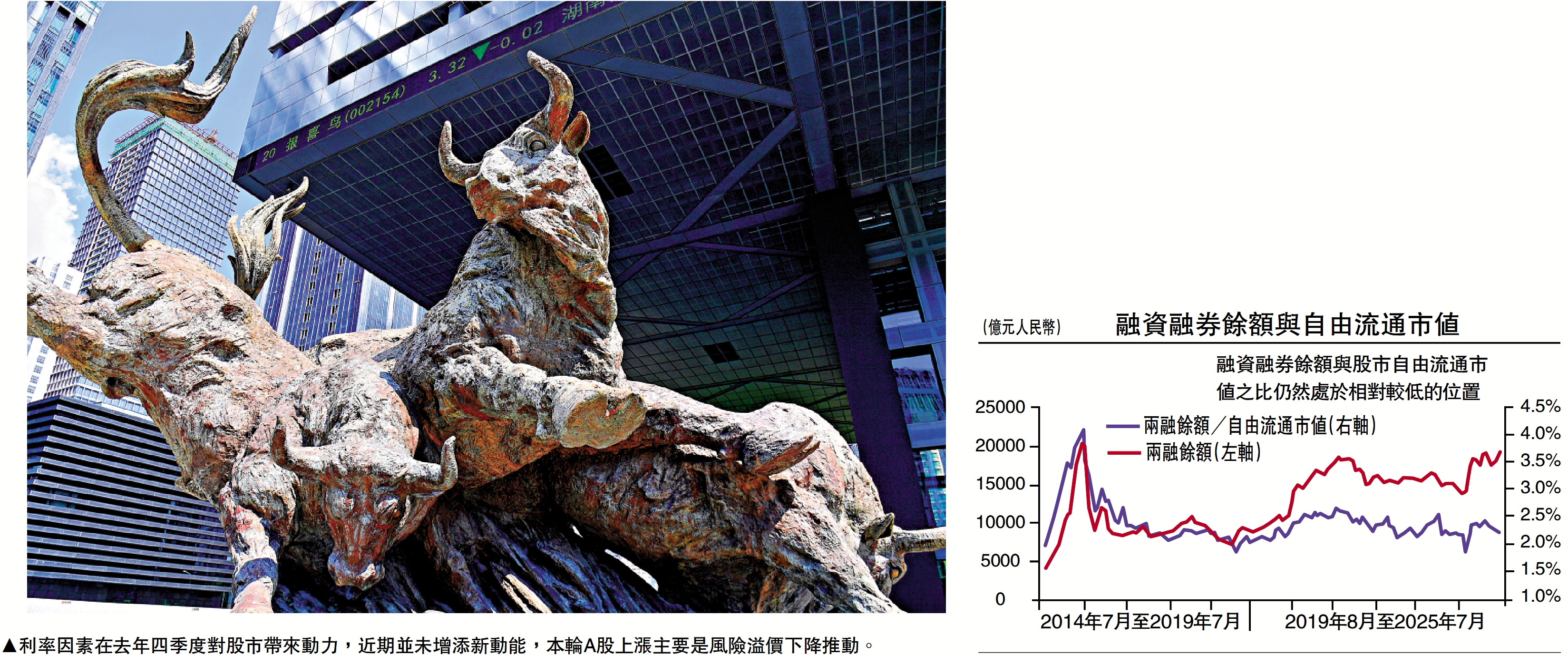 2025年二季度名義GDP同比增速為3.94%,GDP平減指數同比增速為-1.24%。政策利率下降緩慢,2024年9月以來,七天逆回購利率從1.7%下降到1.4%,而近期利率未見明顯變化。利率因素在去年四季度對股市帶來動力之後,近期並未增添新動能。本輪A股上漲的主要是風險溢價下降推動。