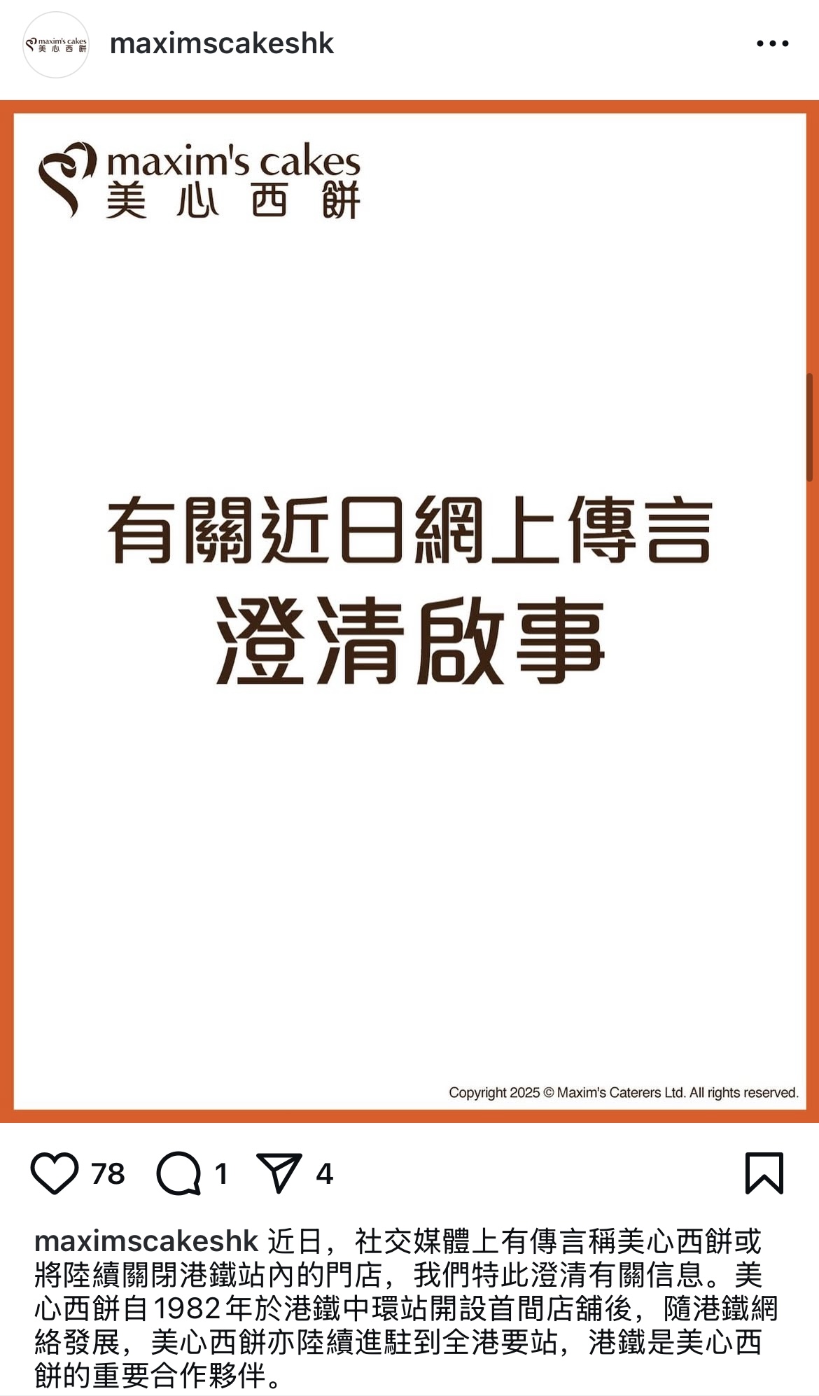 美心西餅在帖文表示,留意到近日社交媒體上有傳言稱美心西餅或將陸續關閉港鐵站內的門店,特此澄清美心西餅自1982年於港鐵中環站開設首間店舖後,隨港鐵網絡發展,美心西餅亦陸續進駐到全港要站,港鐵是美心西餅的重要合作夥伴。