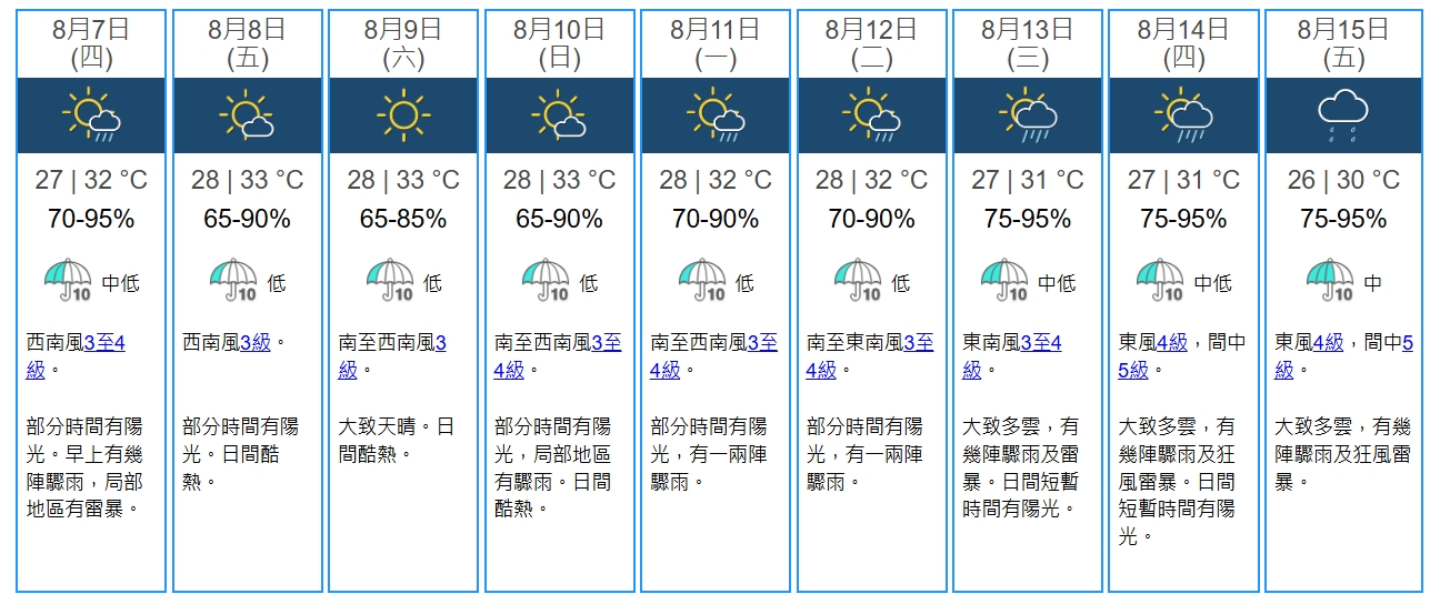 根據天文台9日天氣預報,明日(8月7日)「立秋」早上有幾陣驟雨,局部地區有雷暴;由後日(8月8日)起迎來好天氣,連續三日氣溫介乎28至33度,日間天晴酷熱;到下周中後期開始天氣轉差,隨着高空反氣旋北抬,華南沿岸驟雨逐漸增多。