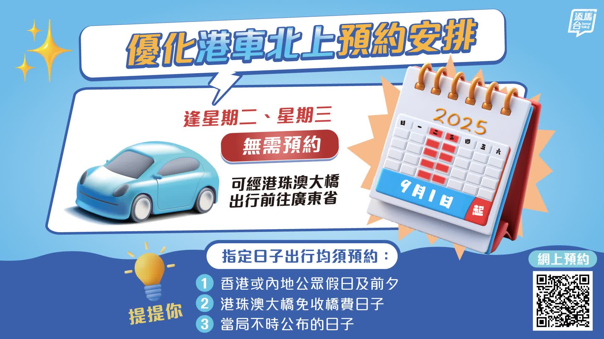 為便利市民更有彈性地在「港車北上」計劃下出行,由9月1日起,逢星期二及三,「港車北上」計劃下的車輛,無須預約便可經港珠澳大橋出行前往廣東省,指定日子除外。看圖了解更多。