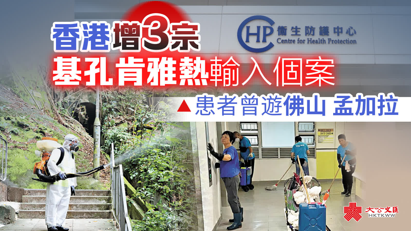 香港文匯報報道,特區政府衞生署衞生防護中心截至昨午3時,再錄得3宗感染基孔肯雅熱輸入個案,患者分別居於鴨脷洲及青衣。今年至今香港累計錄得4宗個案,全是輸入個案。針對近期連日天雨,容易令蚊子滋生,增加基孔肯雅熱等經蚊傳播的疾病爆發,食物環境衞生署表示將繼續聯同各相關部門及持份者加強控蚊滅蚊工作,包括清除地盤及蚊患風險較高地點的積水、殺滅成蚊等,並呼籲市民及持份者包括物業管理公司及建築地盤等,加強檢查及清除所屬地方的積水以防治蚊患。