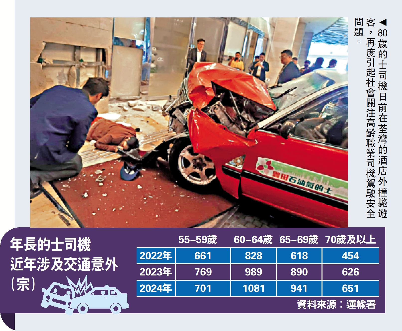 的士司機高齡化問題受到關注。翻查資料,截至今年2月28日,60歲以上持有有效的士正式駕駛執照的人數約13萬。近年涉及年長的士司機意外的數目上升,2024年涉及意外的60歲或以上司機有約2673名。