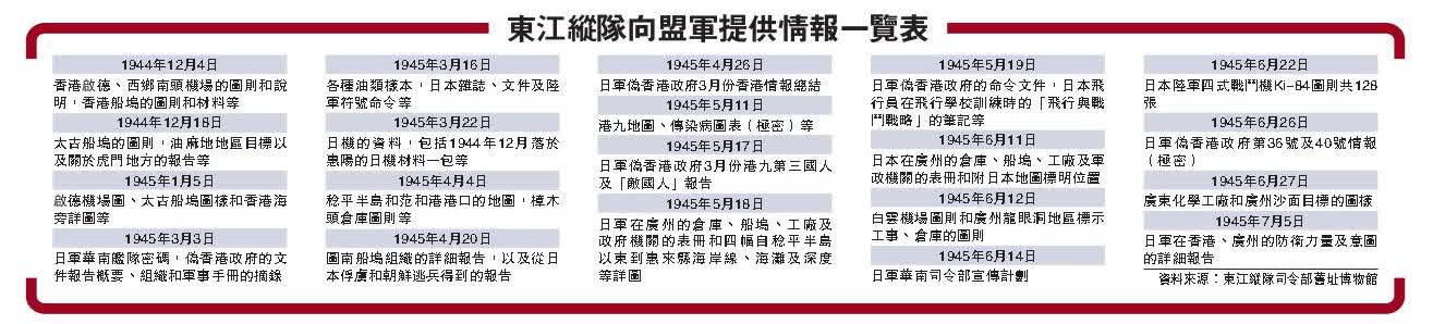其中,港九大隊為美軍提供了大量情報,如香港日軍的海防詳圖,日軍在港機關、油倉、機場、船塢等詳細圖樣,日本華南艦隊密碼,偽香港政府組織詳情、文件報告和軍事圖冊摘錄,日軍在香港的防衛力量,廣九沿線日軍工事圖解等。由於港九大隊及其兄弟部隊的突出表現,美軍盛讚其情報工作「對美國戰略部隊在中國的組織的成功有着決定性的貢獻」。