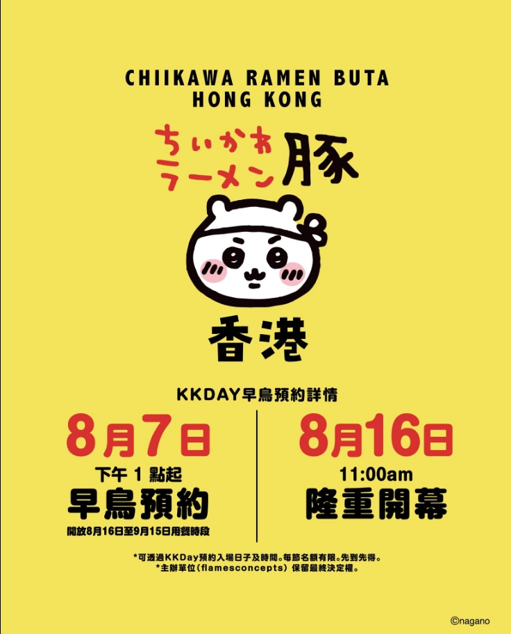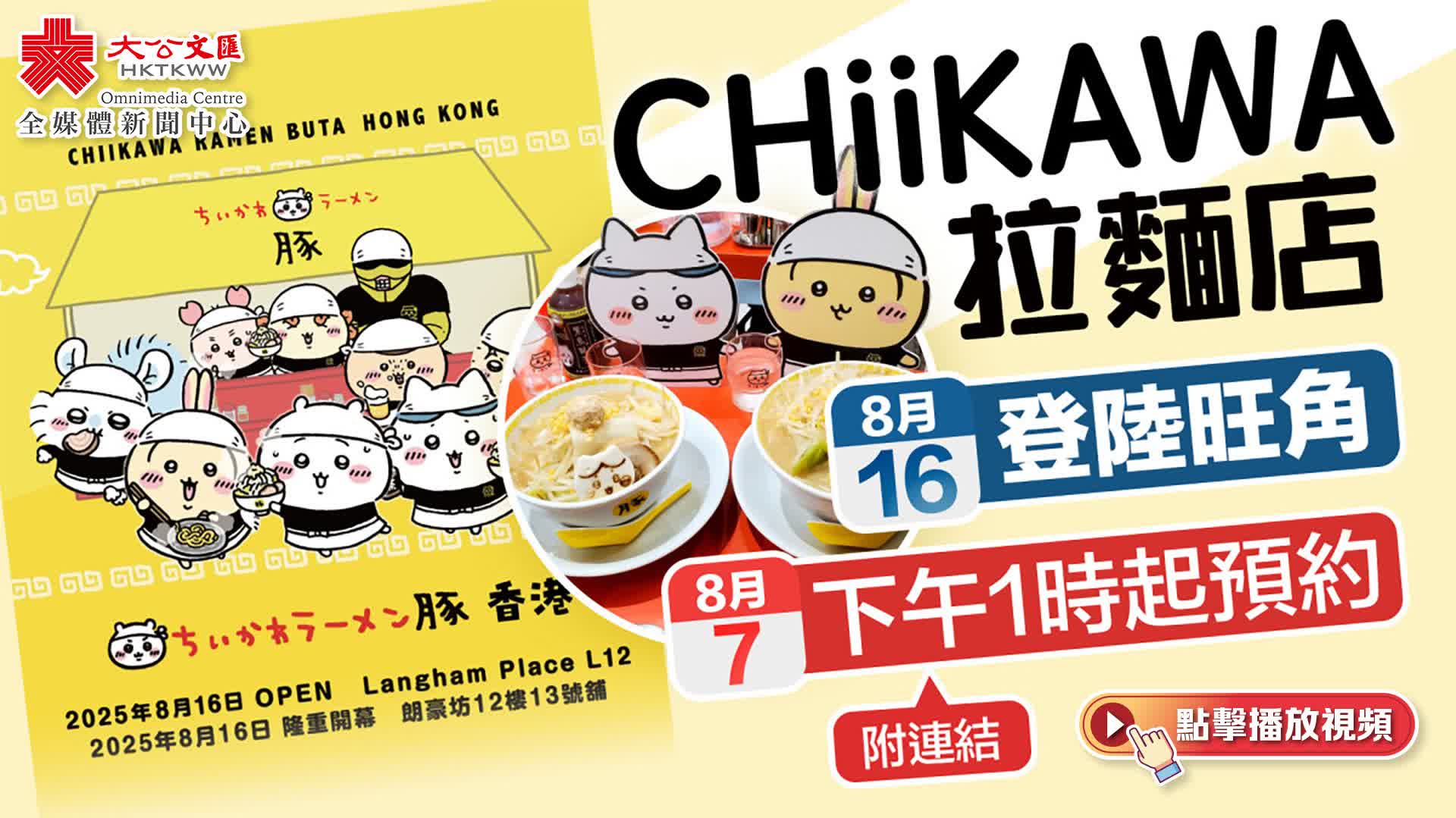 大公文匯全媒體報道,日本人氣漫畫角色CHIIKAWA的主題拉麵店「吉伊卡哇拉麵」首間海外分店將於8月16日在旺角朗豪坊開幕,今日(7日)下午1時於KKDAY開放首一個月(8月16日至9月15日)的預約名額。此外,香港店沿用日本本店預約模式,每人需預購一瓶價值38元港的黑烏龍茶作訂金。