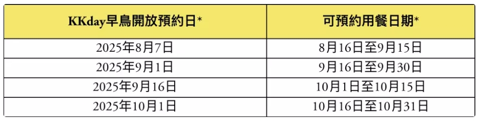 首輪預約將於今日下午1時,於KKDAY開放首一個月(8月16日至9月15日)的預約名額;之後的預約開放時間,可留意Flames Concepts的社交平台及KKDAY活動主頁的公布。顧客於KKDAY選定入座人數及時段後,須先為每位顧客預購一瓶黑烏龍茶(價值38港元)作為訂金。黑烏龍茶將於入座當日派發,訂金不可兌換或扣減餐費。