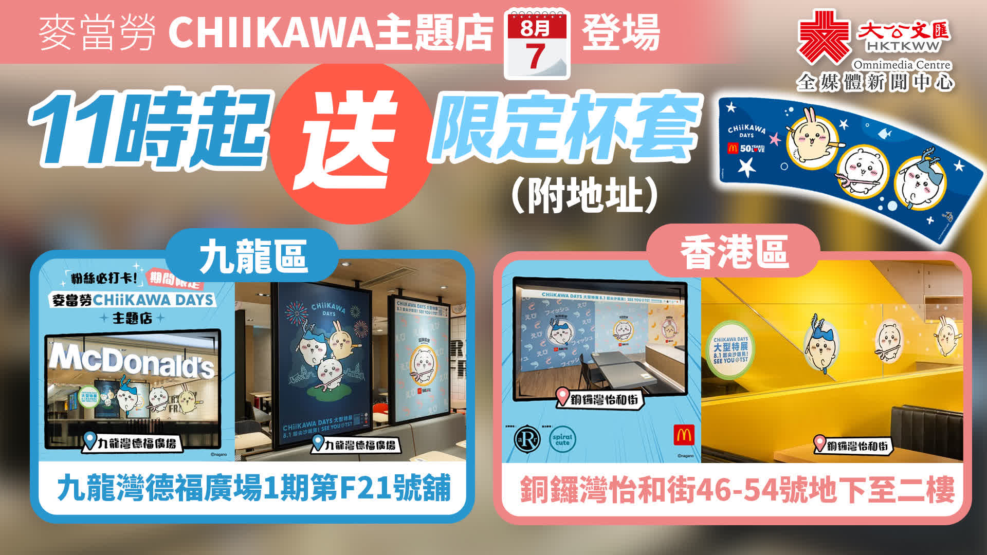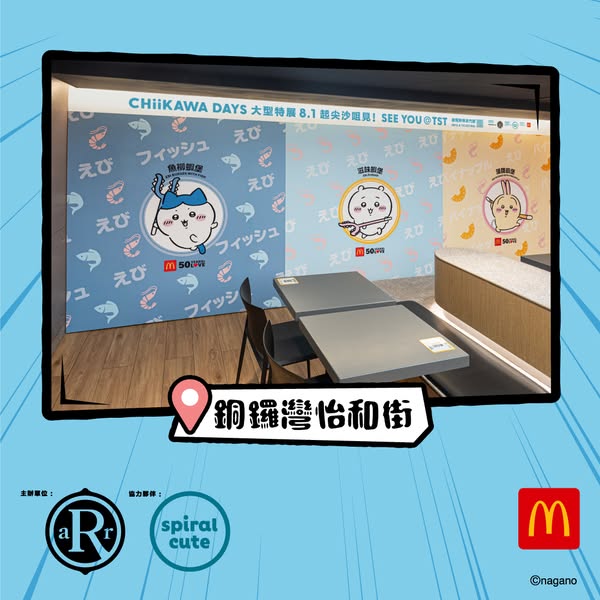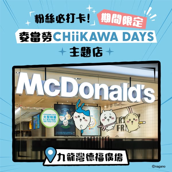 大公文匯全媒體報道,為配合「CHIIKAWA DAYS」大型特展,麥當勞推出相關主題活動,今日(7日)上午11時起,銅鑼灣怡和街及九龍灣德福廣場兩間麥當勞變成CHIIKAWA DAYS期間限定主題店,並會推出限定杯套一款,數量有限,送完即止。