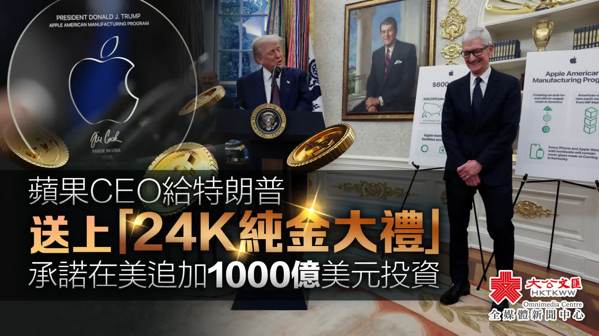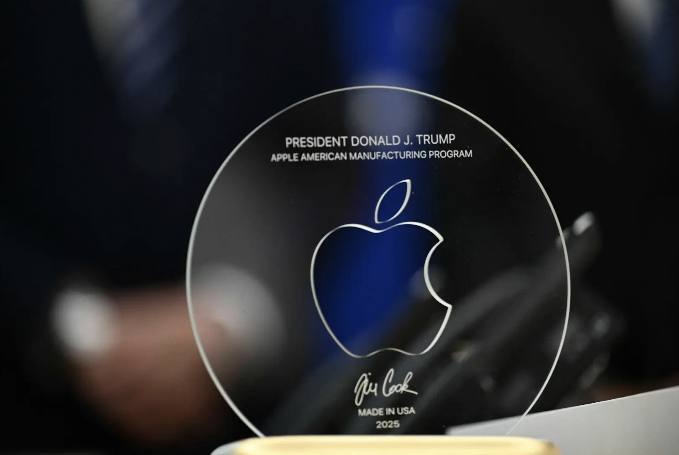 這塊鐫刻着特朗普姓名與蘋果標識的牌匾,採用肯塔基州生產的玻璃製成,鑲嵌於猶他州出產的24K黃金底座之上,其設計出自蘋果公司一位前美國海軍陸戰隊下士之手。「這塊玻璃來自康寧生產線,專為總統雕刻,全球獨此一件,底座取材自猶他州的24K純金。」庫克在白宮橢圓形辦公室呈獻牌匾時介紹。