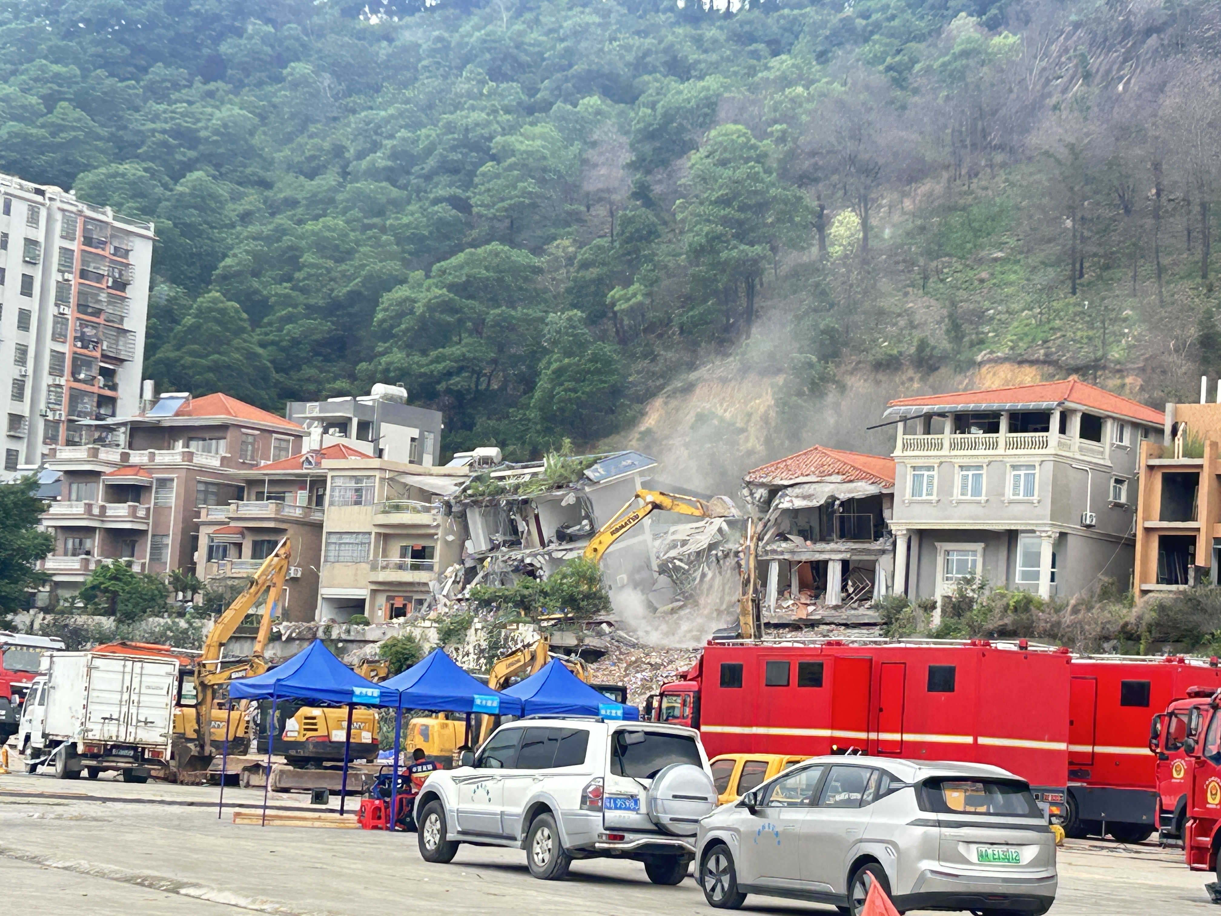 7日下午14時左右,記者在現場看到,消防人員剛結束新一輪搜救,未有被困人員被搜救出。消防人員撤出後,兩台大型機械開始對其中一棟受損嚴重的房屋進行破拆。作業車從不同角度對樓房的房頂、牆面和支撐柱進行拆除,同時清除房屋四周覆蓋的泥土和雜物。過程中,有汽車被挖掘機從廢墟中挖出,屋中不斷有床墊、家具等被清理出。