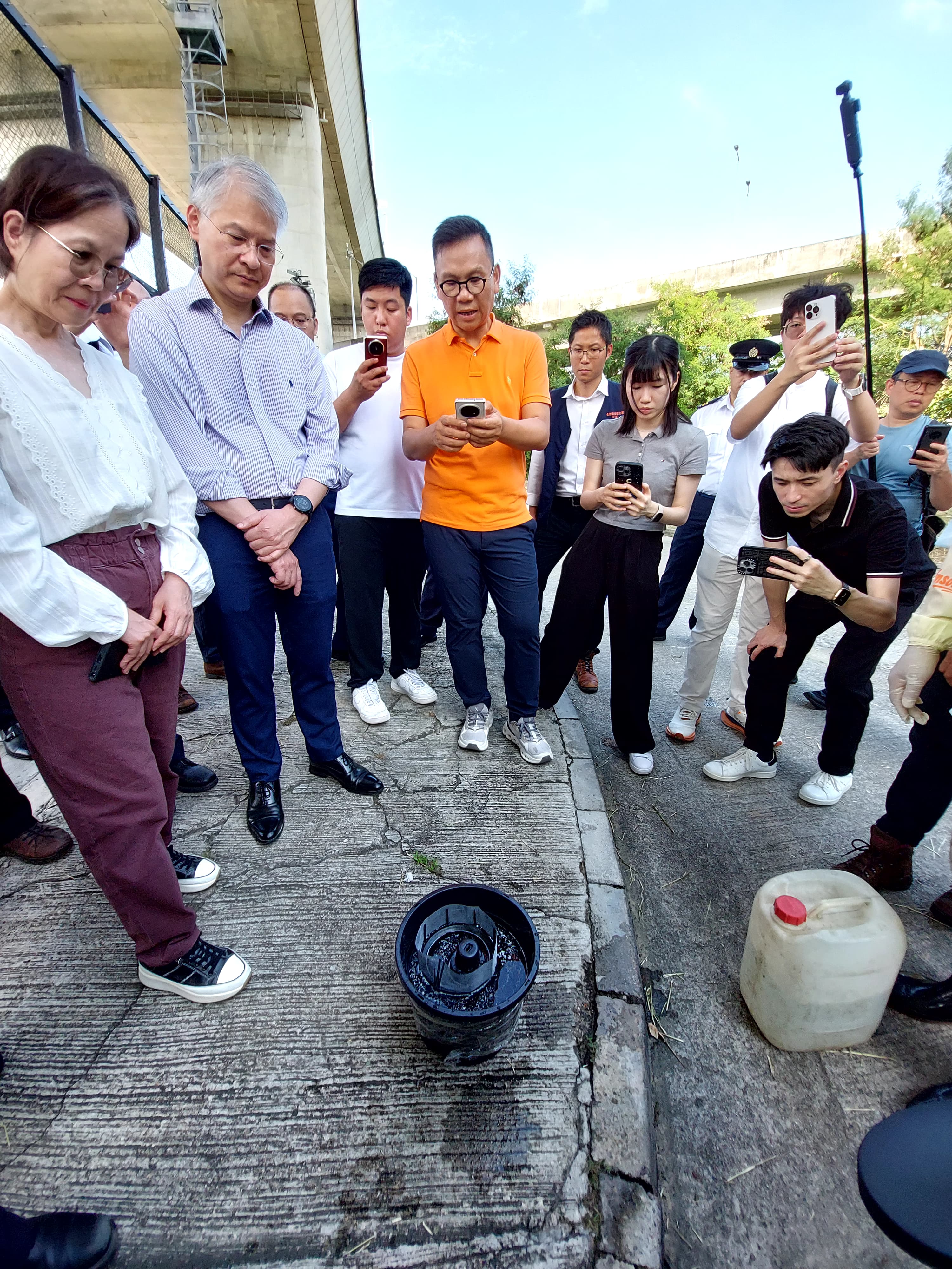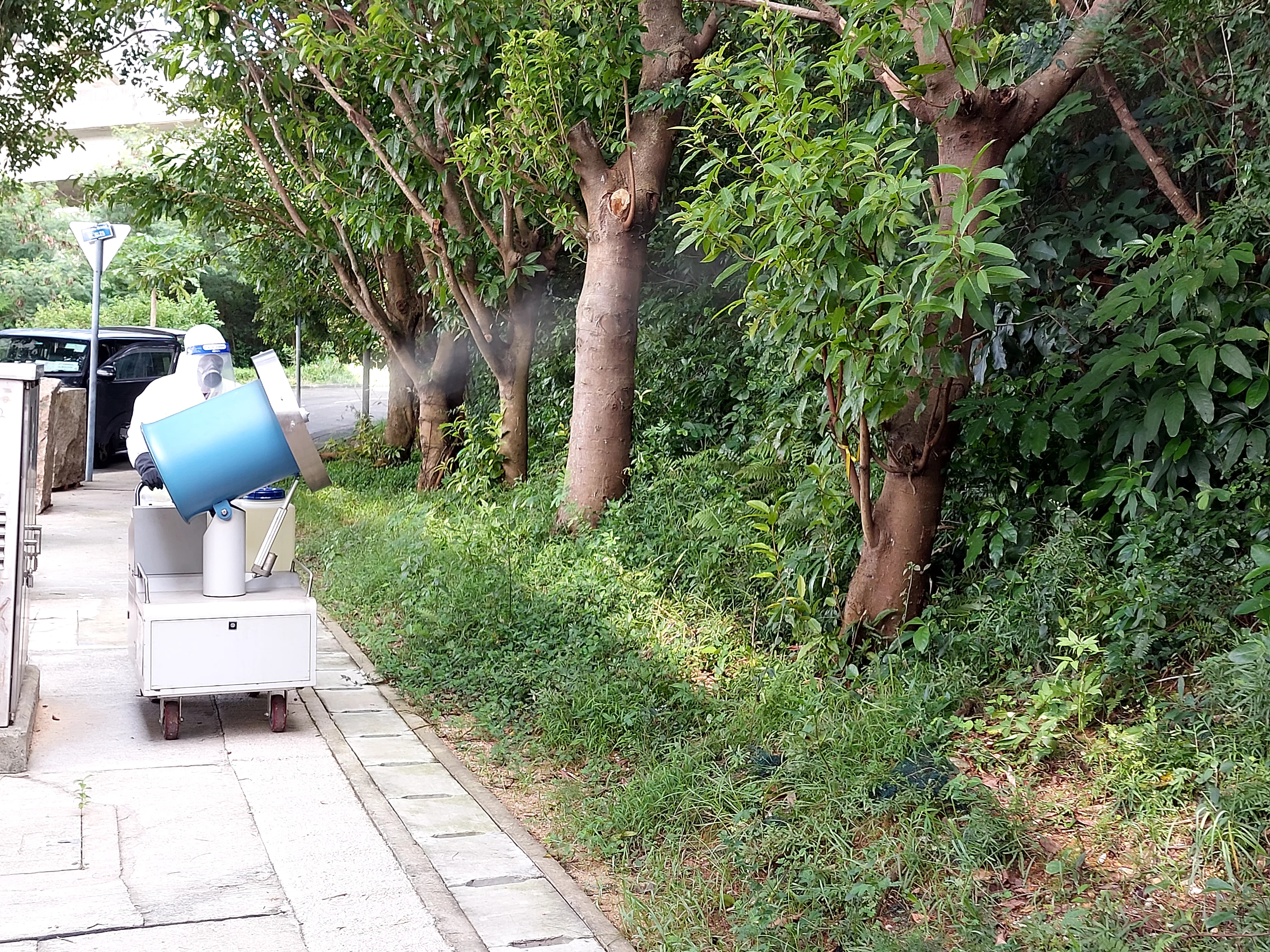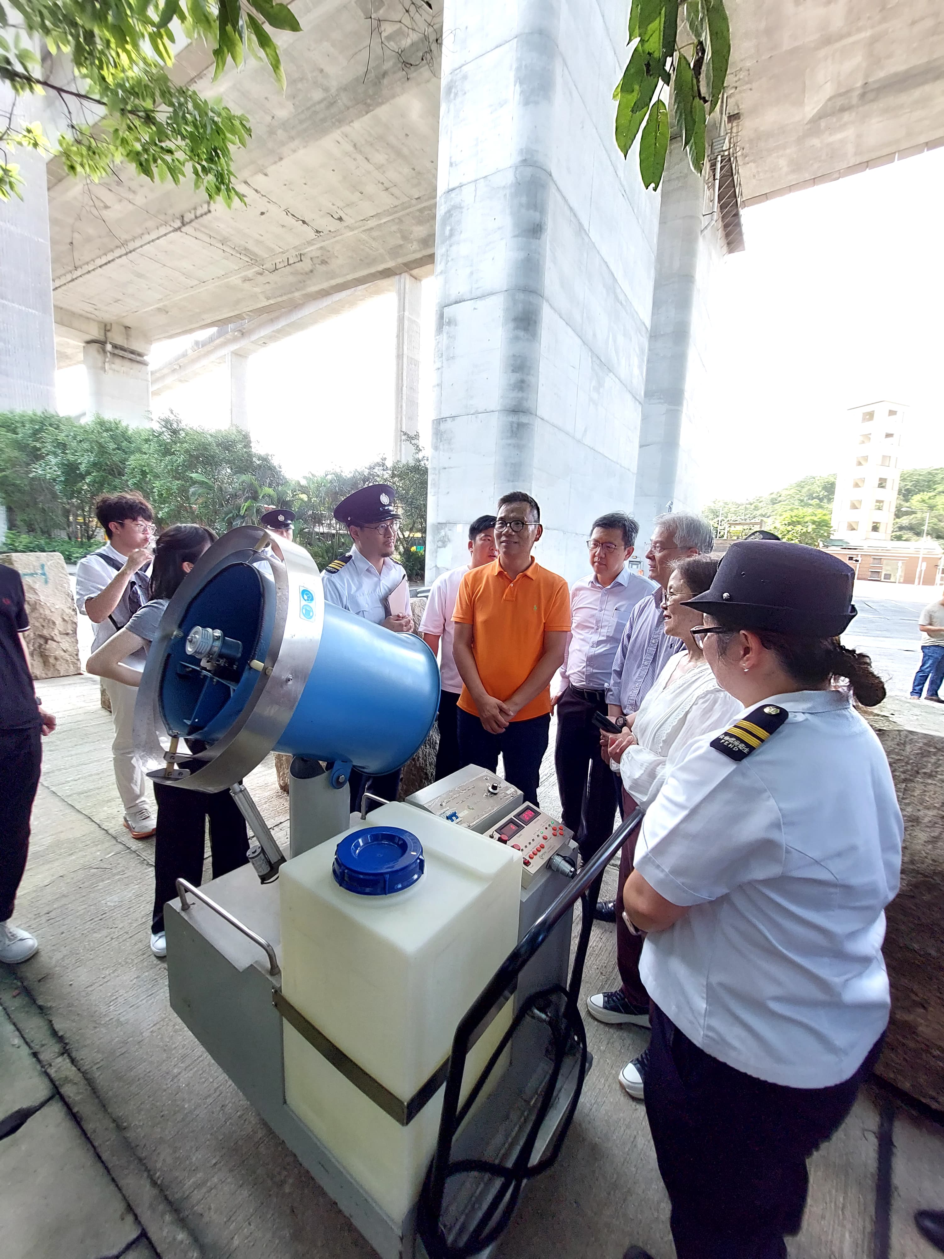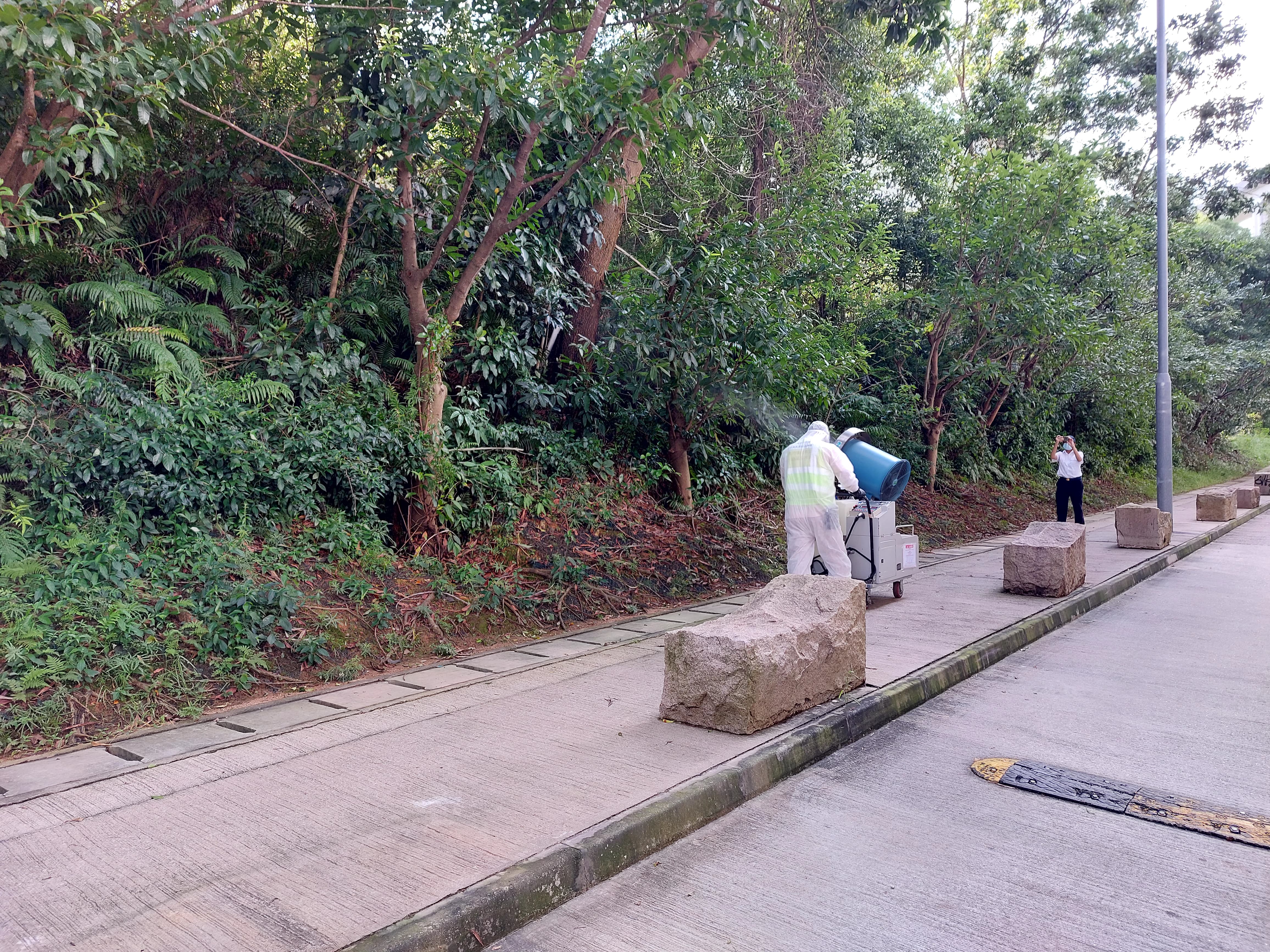 食環署人員即埸向視察的環境及生態局副局長黄淑嫻、荃灣民政事務專員區家盛、立法會陳恒鑌議員、荃灣區議會黄啟進、馬灣關愛隊、馬灣鄉事會及珀麗灣業委會代表等社區人士介紹,目前應用的可同時防治幼蟲和成蚊的新型捕蚊器。該新型捕蚊器內的生長調節劑會令幼蟲無法生長,除此之外,還用大型霧化器,可以180度噴灑滅蚊藥,有效噴灑高度達到30米,適合山邊作業等野外環境應用。
