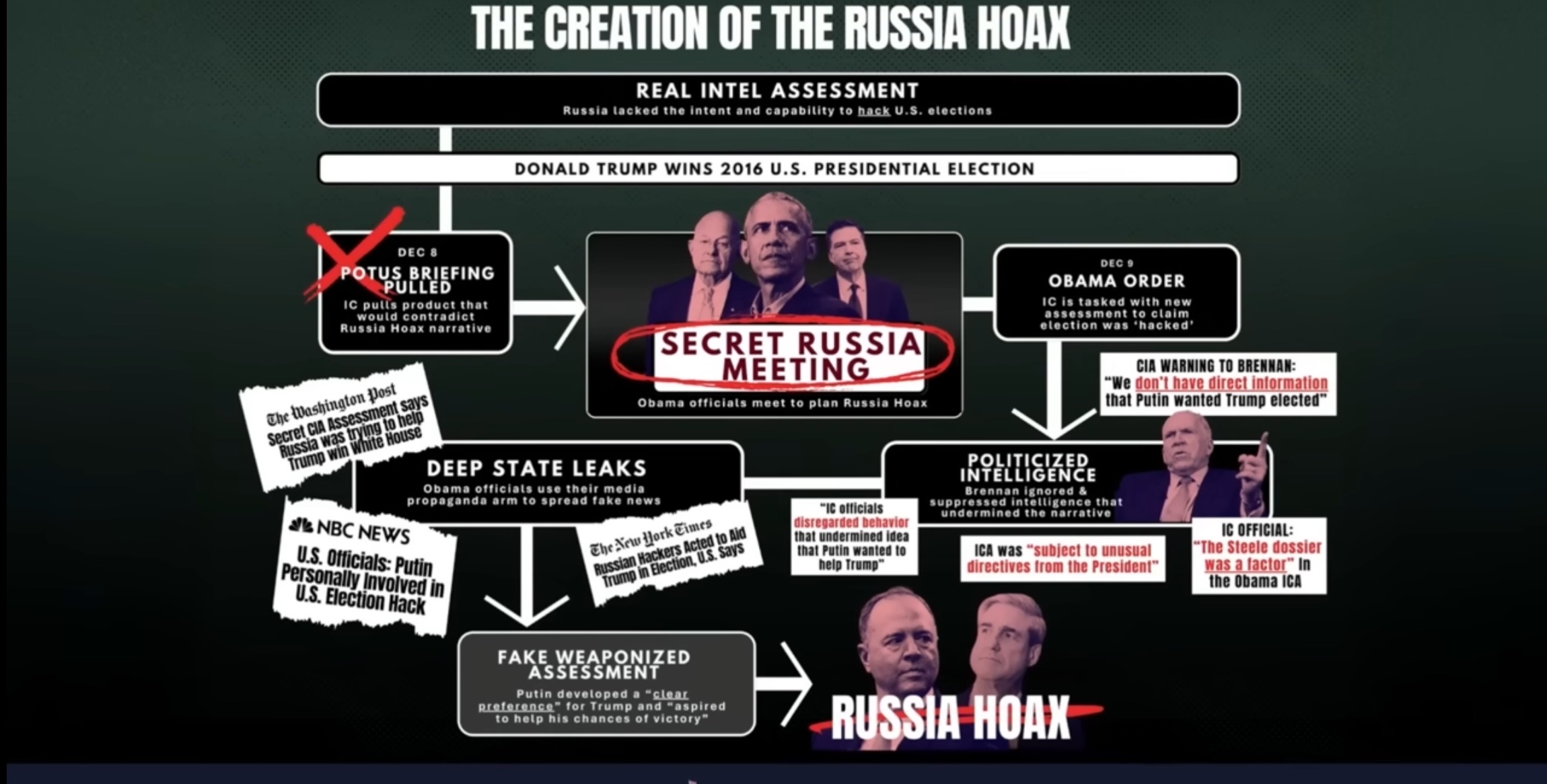 聲明稱,美國情報界曾在2016年11月美國總統選舉前的幾個月內達成共識,認為俄羅斯沒有干涉選舉的意圖和能力。但在12月9日,白宮召集美國國家安全委員會高級成員討論俄羅斯問題。會後,克拉珀的助理發送電子郵件要求情報部門「根據總統(也就是奧巴馬)的要求」給出一份新的情報評估,詳細說明俄羅斯「為影響2016年大選而採用的工具和行動」,這項工作由當時的國家情報總監辦公室牽頭,中央情報局、聯邦調查局、國家安全局和國土安全部都參與其中。