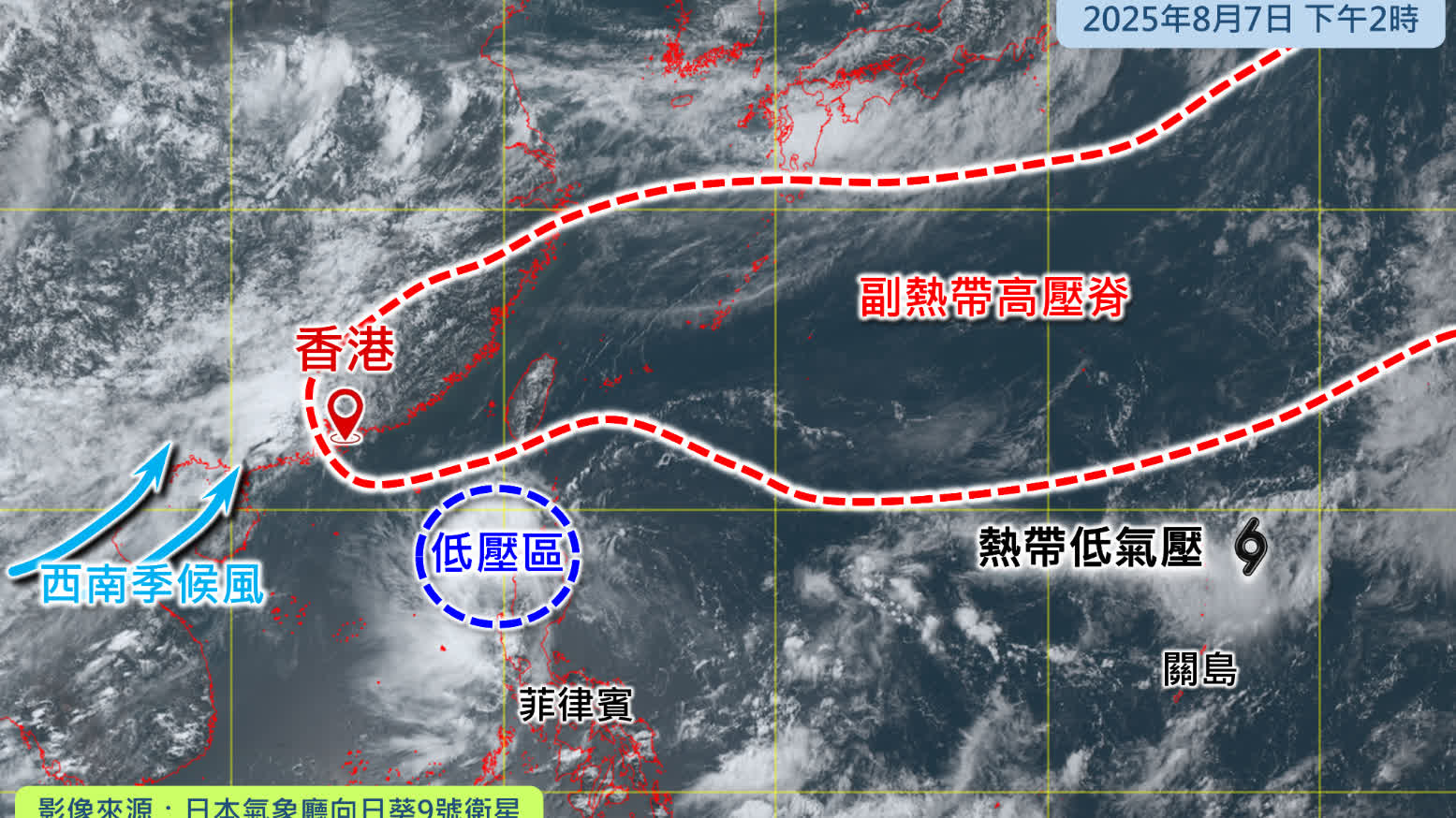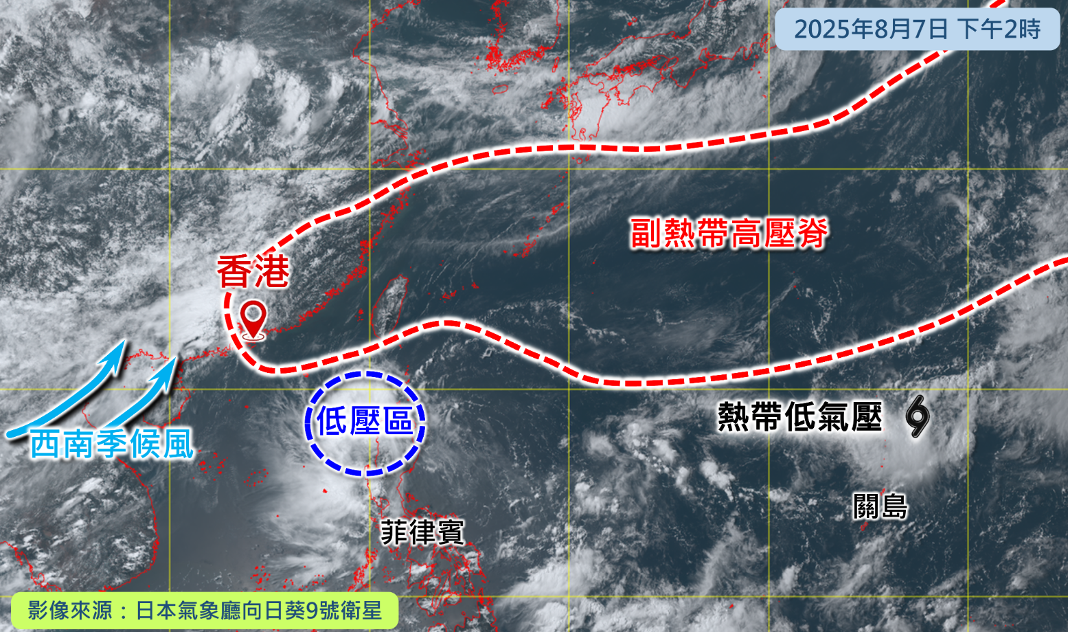 文章指,衛星雲圖顯示高空反氣旋正由西北太平洋向西延伸至南海東北部,預料高空反氣旋會在未來兩三日為中國東南部帶來大致晴朗及持續酷熱的天氣。從衛星雲圖可見菲律賓至關島附近一帶海域均有對流雲團發展。而位於呂宋北部附近的低壓區會在未來一兩日進入南海並橫過南海中北部,但由於南海的垂直風切變較大,不利該低壓區進一步發展。根據現時評估,該低壓區會維持較弱強度及不會顯著增強,但受與其相關的驟雨影響,下周初南海北部會有驟雨。
