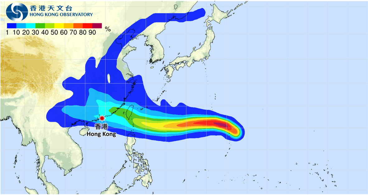 路徑概率預報圖亦顯示位於關島以北海域的熱帶氣旋會採取偏西方向移動,移向呂宋海峽至台灣一帶,但隨後路徑存在相當變數。