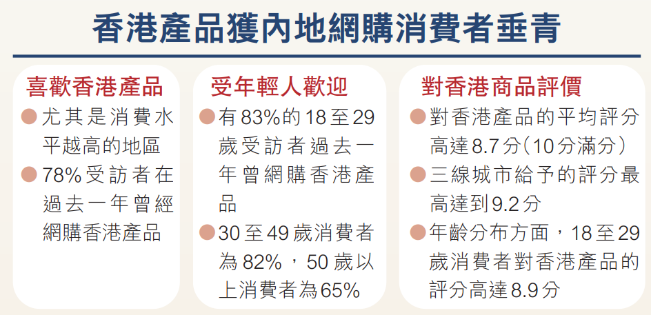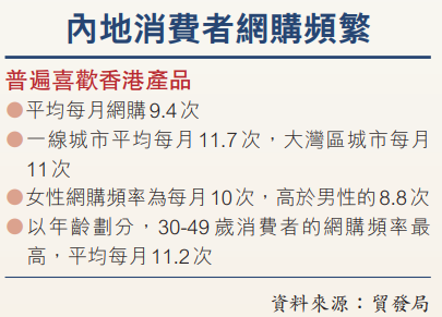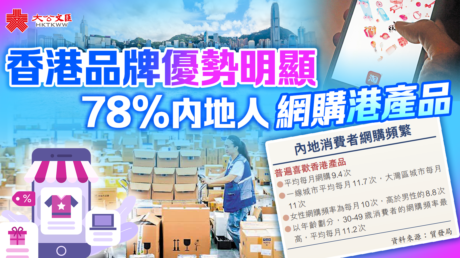 (香港文匯報記者 莊程敏)「香港品牌」的產品在市場上一向甚有口碑,令港商拓展內地電商業務方面具備不少優勢。香港貿發局昨發表《港商深耕內地電商零售市場 - 消費者調查報告》,調查結果反映香港產品普遍受內地網購消費者歡迎,78%內地受訪者過去一年曾網購香港產品。內地消費者對香港品牌的信任度高,對產品有高度評價,為港商開拓內地電商市場提供穩健基礎,港商可善用香港品牌優勢,選擇合適平台作電商業務銷售。