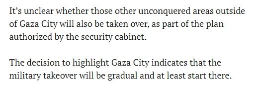 以色列媒體《以色列時報》在報道中稱,目前尚不清楚為何該聲明只提到接管加沙城,而不是像內塔尼亞胡此前宣布的那樣「全面佔領加沙地帶」。也不清楚作為安全內閣批准的計劃的一部分,加沙城以外的其他地區是否也將被佔領。不過,聲明中突出了加沙城,這表明軍事接管將是漸進的,至少會從加沙城開始。