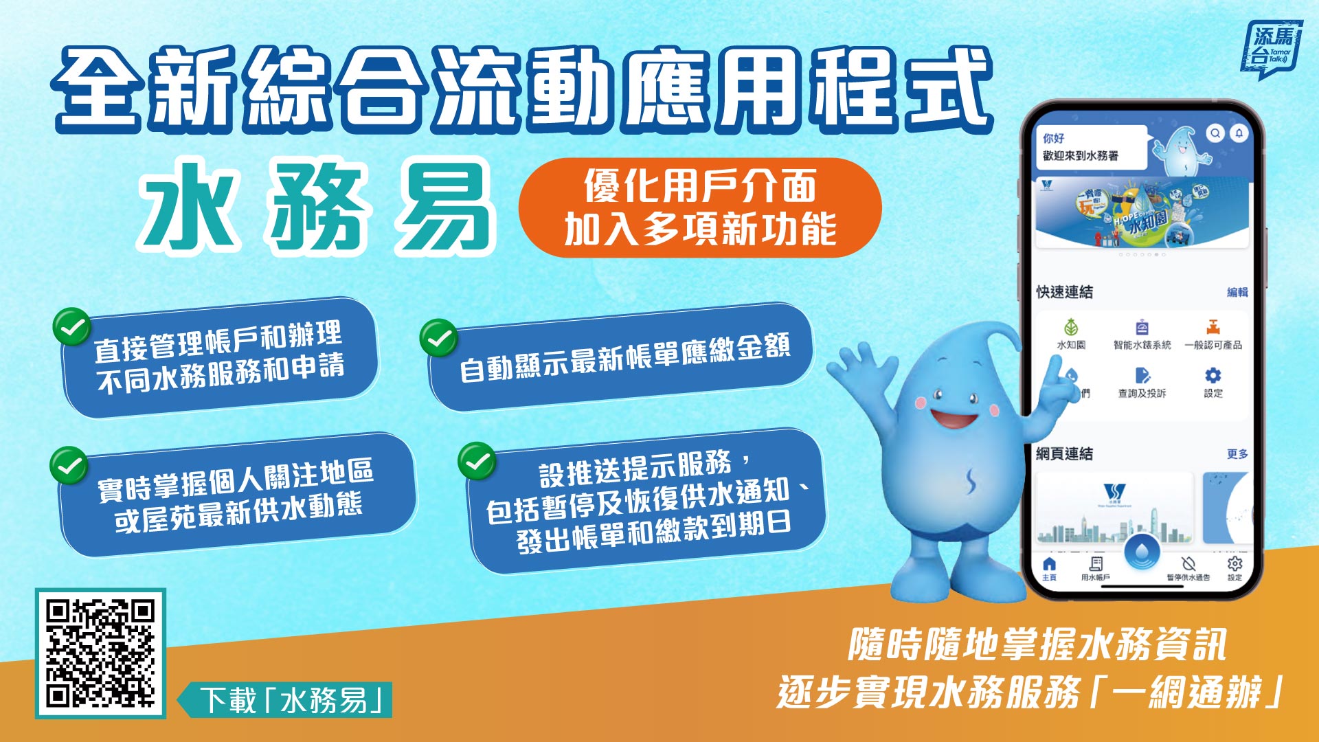 水務署推出全新綜合流動應用程式「水務易」,結合現有的流動應用程式,並優化用戶介面和加入多項新功能,提供一站式個人化數碼水務資訊平台,讓市民隨時隨地掌握多項水務資訊,逐步實現水務服務「一網通辦」。