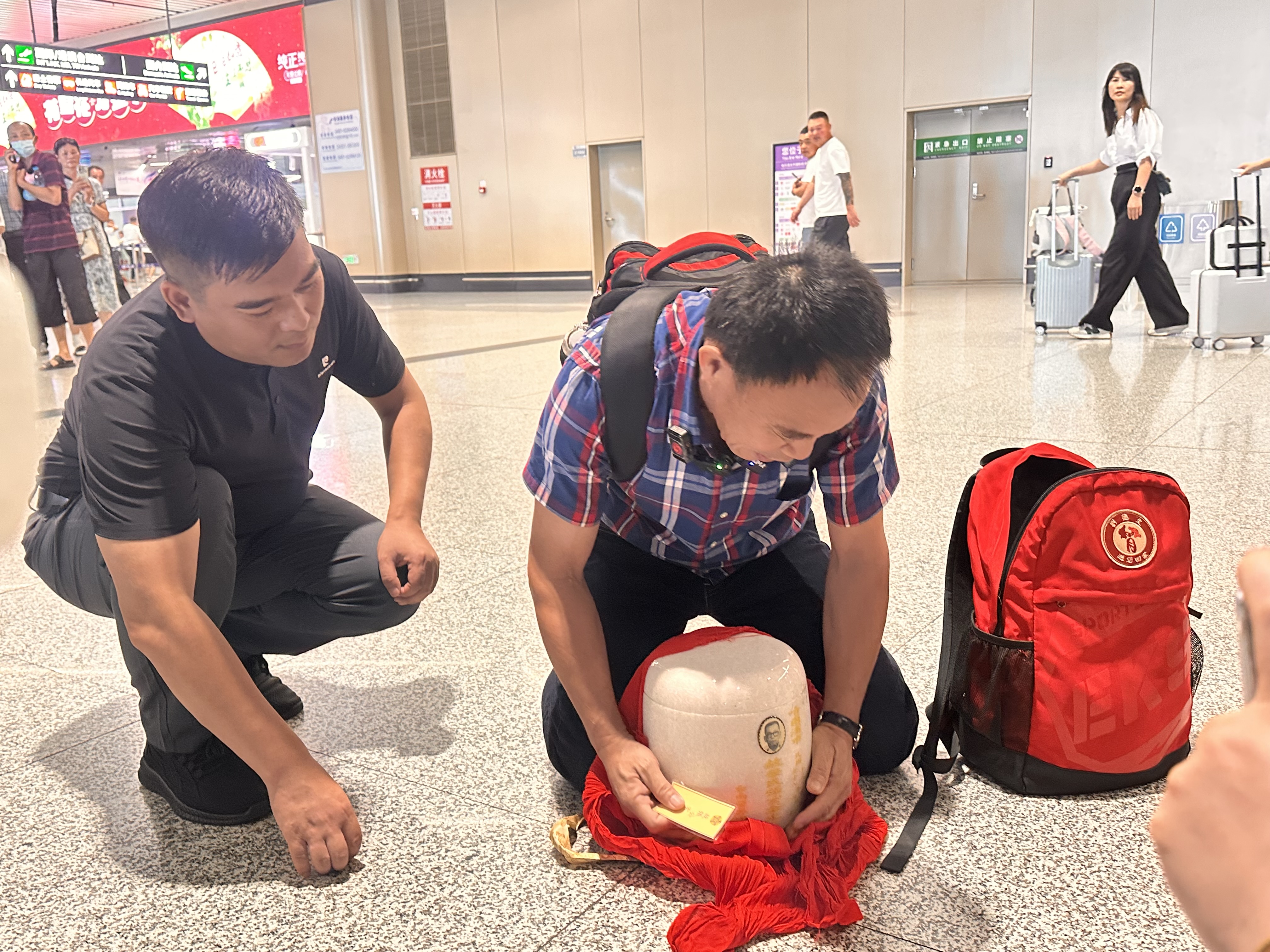 (大公文匯網記者王欣欣 哈爾濱報道)8月5日,台灣高雄市左營區祥和里的里長劉德文抵達哈爾濱太平國際機場。他雙膝跪地,鄭重地從背包中取出白色骨灰罈,壇內安放的是漂泊在外76載、哈爾濱籍大陸去台老兵張宏奎的骨灰。「張伯伯,我們到哈爾濱來了,我先讓你着地,這是你的家鄉最親的土地,我終於送您回家了!」這是今年被劉德文送回家的第33位台灣老兵,亦是他從事23年「靈魂擺渡人」送回家的將近400位先人之一。
