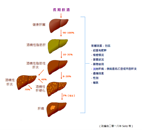 飲酒會影響健康,引致精神和行為障礙(包括酒精依賴)及心血管疾病和某些癌症。酒精(乙醇)在肝臟裡被分解時,會產生有毒代謝物和副產物,例如「乙醛」,這些有毒物質可引發肝臟細胞發炎和損傷,有可能引致不同程度的問題 — 從病情較輕微且可逆轉的「酒精性脂肪肝」開始,繼而可能演變成「酒精性脂肪肝炎」 (即肝臟積聚脂肪和發炎),若繼續飲酒,更可能惡化成不可逆轉的「酒精性肝硬化」,甚至導致肝癌!而這類酒精相關肝病,正是全球最常見的慢性肝病之一。