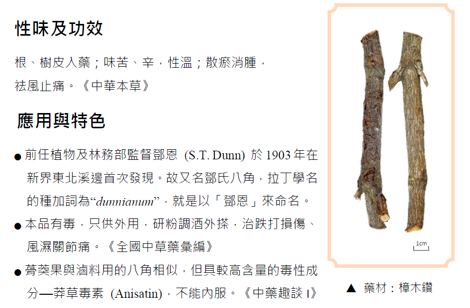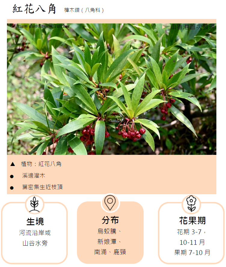 我們精心挑選了50種具香港特色的藥用植物,這些植物的選取準則包括(1)由香港首次發現 (2)中文名稱或拉丁學名以香港或香港地名命名 (3)在香港有獨特的使用習慣或使用歷史 (4)與香港有淵源 (5)在香港特色生境分布 (6)具地域特色 (7)在香港常用的生草藥或常見的商品藥材原植物,及(8)香港大眾廣泛應用的湯水或涼茶材料。系列的第一期向大家介紹由香港首次發現的藥用植物—紅花八角。