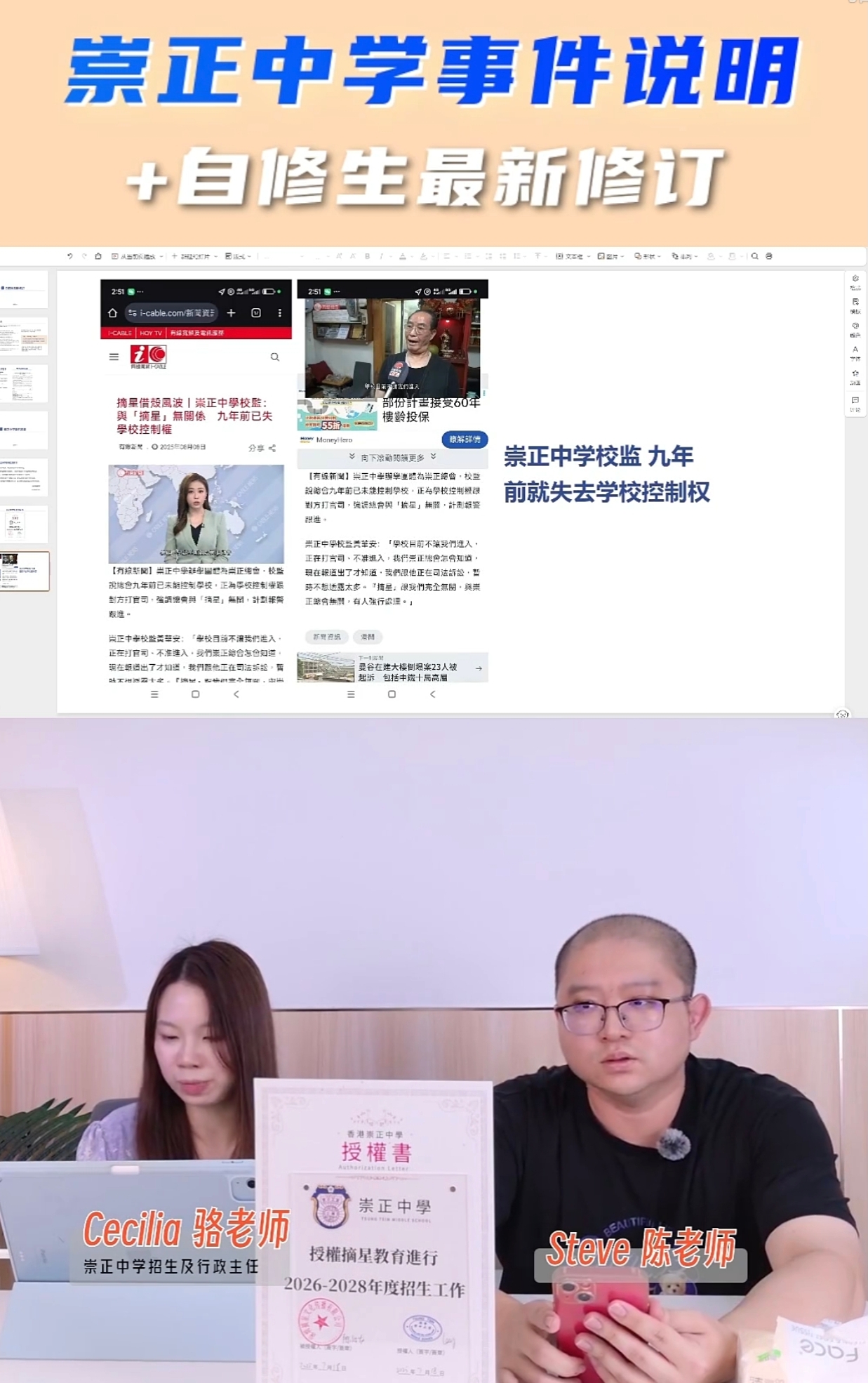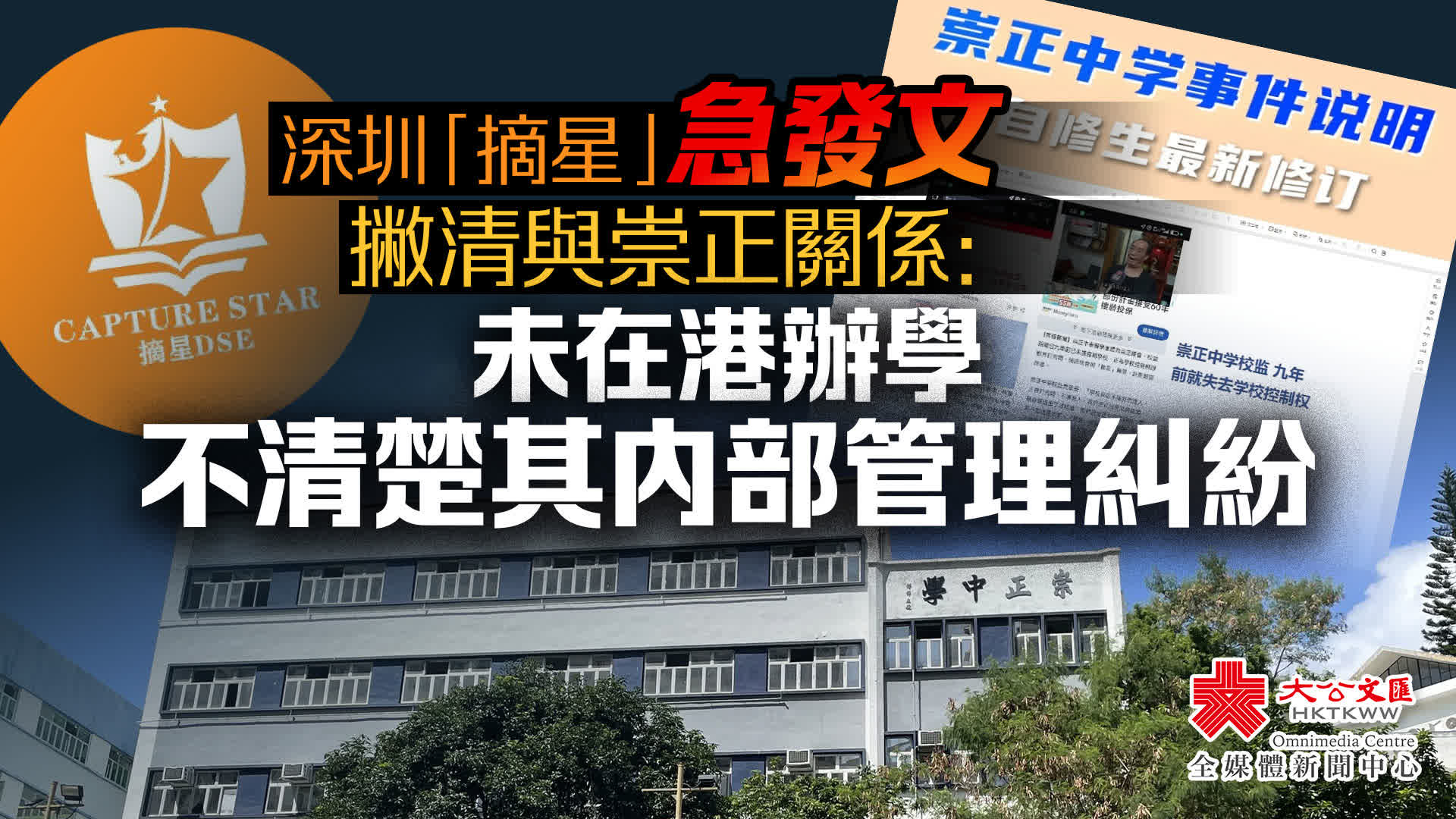 此前自稱摘星DSE創始人的駱姓老師8日通過網絡直播就崇正中學事件進行說明,不過一反此前說摘星全面負責管理崇正中學管理運營的說法,其強調摘星與崇正中學只存在招生方面的合作。她在直播間展示崇正中學授權摘星教育進行2026-2028年度招生工作的授權書。對於摘星教育緊急刪除招生簡章,她表示,此前招生簡章中有些表述用詞不當,引起誤會,會重新修訂以後再行發布。