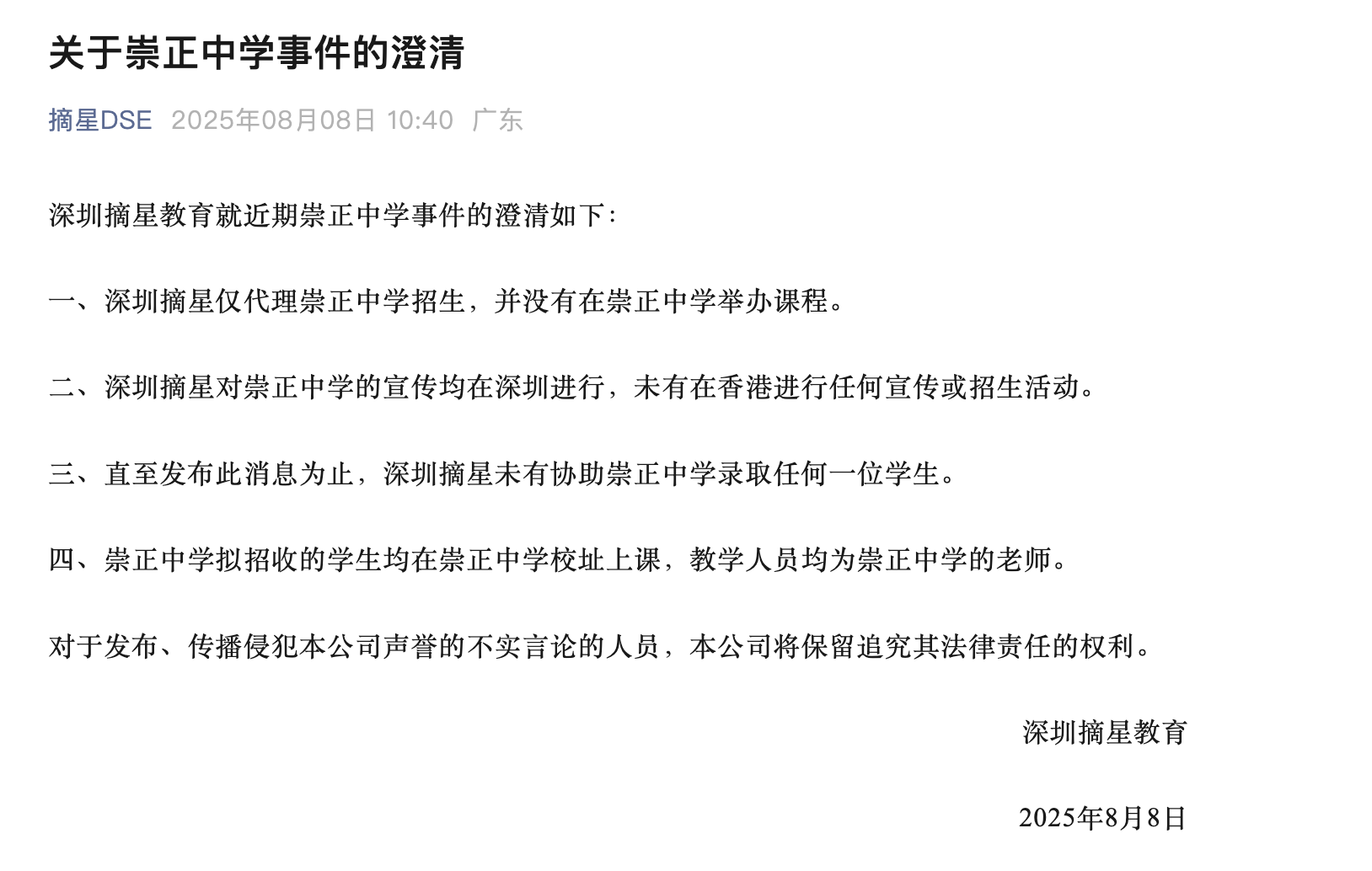 摘星教育今日(8日)在微信公眾號發布一則澄清聲明,指深圳摘星僅代理崇正中學招生,並沒有在崇正中學舉辦課程;深圳摘星對崇正中學的宣傳均在深圳進行,未有在香港進行任何宣傳或招生活動;直至發布此消息為止,深圳摘星未有協助崇正中學錄取任何一位學生;崇正中學擬招收的學生均在崇正中學校址上課,教學人員均為崇正中學的老師。