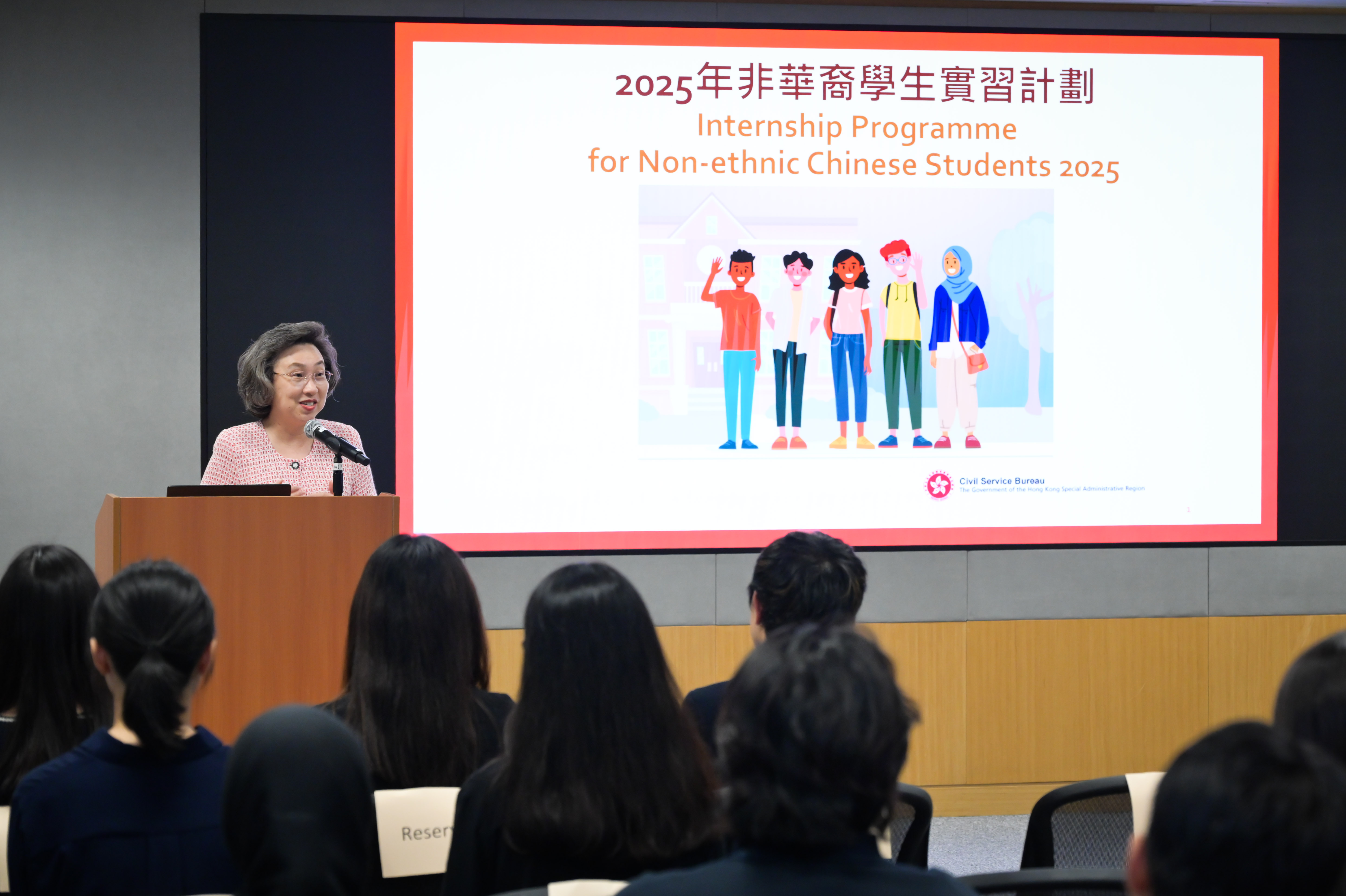 公務員事務局局長楊何蓓茵八月八日出席非華裔學生政府部門實習計劃分享會,聆聽學生分享實習體驗,並鼓勵他們更好裝備自己,為未來生涯規劃做好準備。