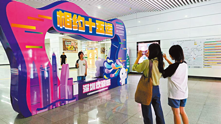 (香港文匯報記者 郭若溪、李薇 實習記者 周瑜 深圳報道)上班路上就能偶遇「喜洋洋」和「樂融融」,地鐵站台突然變身「全運展廳」…… 隨着盛會的腳步日益臨近,作為主要承辦城市之一,深圳正將十五運會元素悄然融入城市的每個角落,讓喜迎全運的熱烈氛圍在街頭巷尾持續升溫。近日,深圳地鐵在機場、崗廈北、福田等十個站點全新布設十五運會主題打卡點,獨特的設計與濃厚的賽事氛圍引得市民、遊客爭相駐足留影。