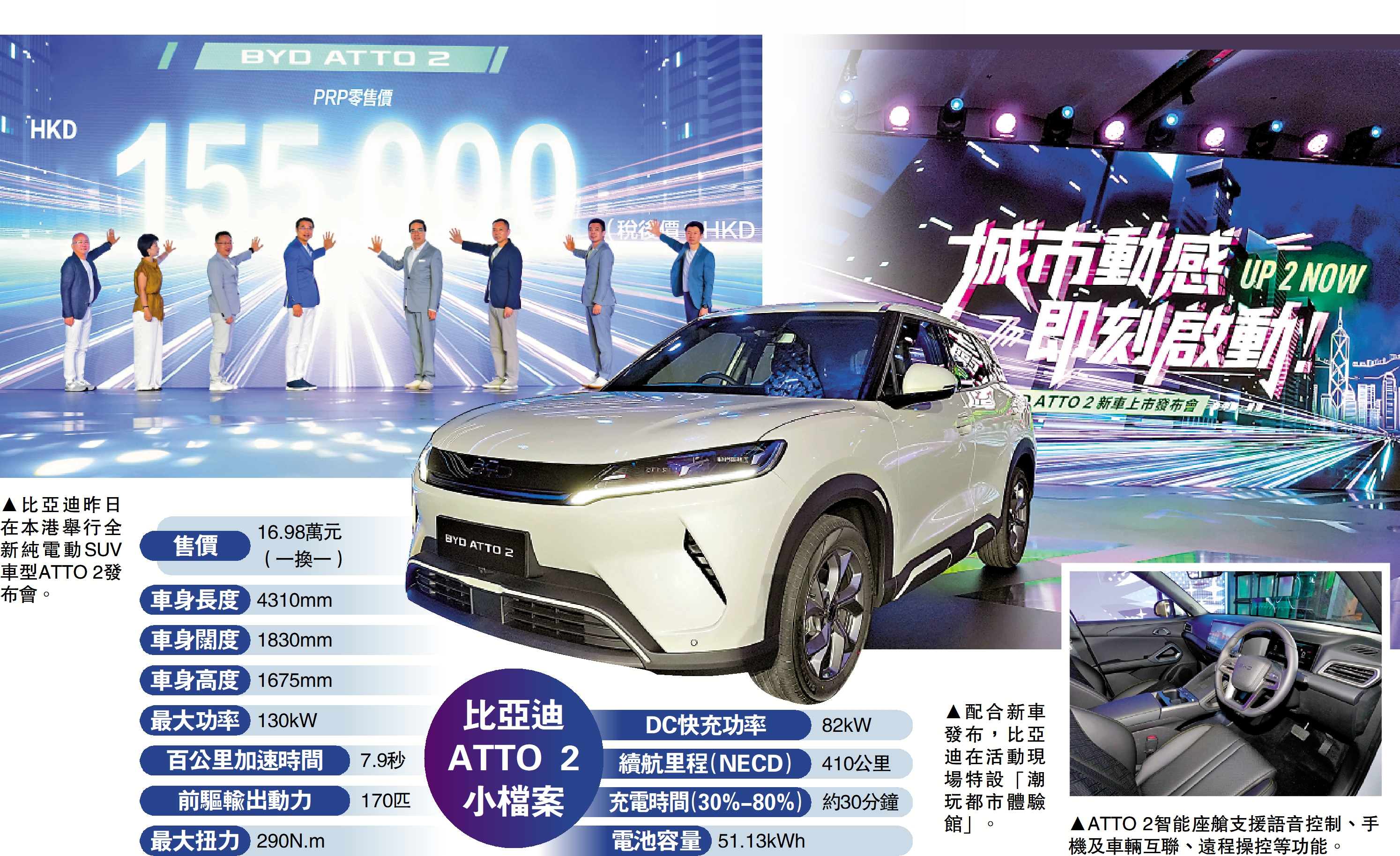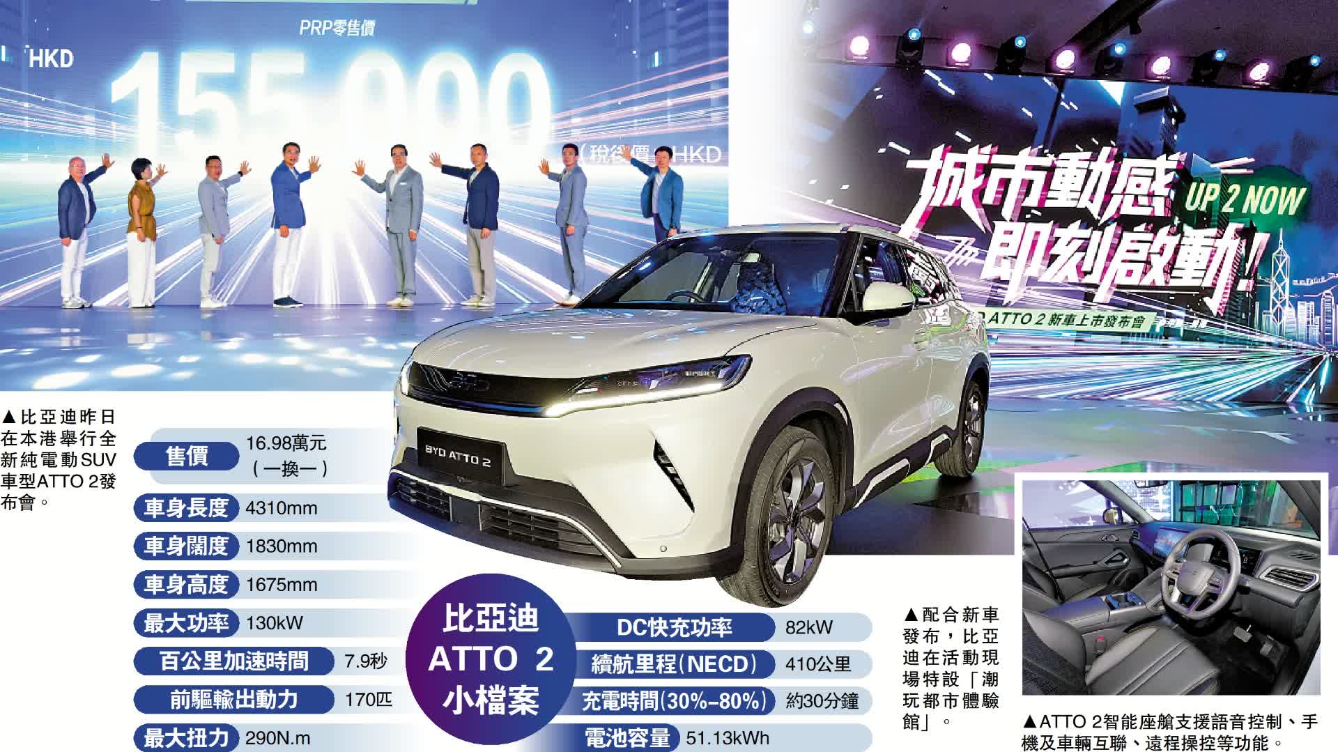 比亞迪昨舉行全新純電動SUV車型ATTO 2發布會,一換一售價為16.98萬元,低於市傳的18萬元,公司希望可為年輕人提供具性價比的產品,是「用得慣、買得起」的車輛。