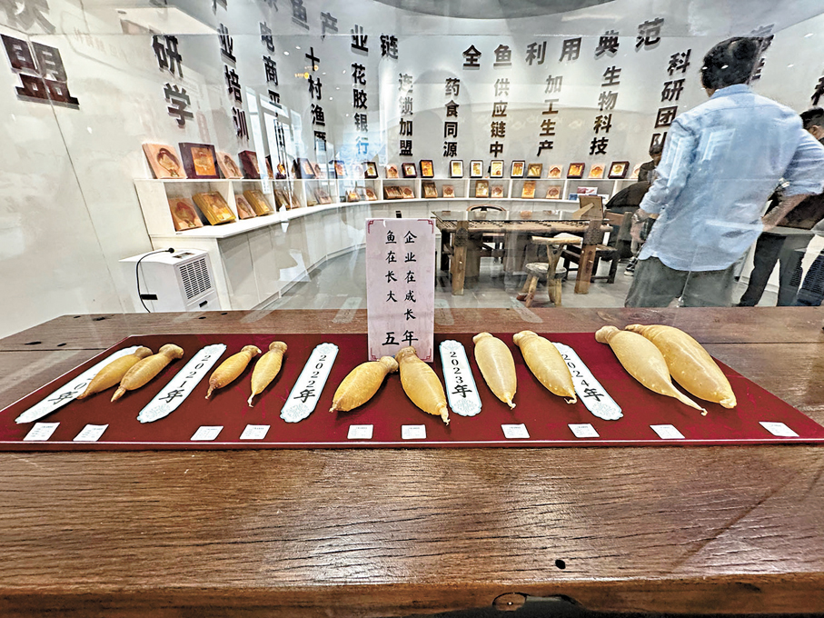 靠山吃山,靠海吃海。一方海(廣東)海洋牧場不僅在深海養殖,同時還在岸上擁有一個加工廠,專門加工深海養殖的金鮸魚。「我們有句俗話,『有錢吃鮸,無錢免吃』,金鮸魚在市場上一直是搶手貨。」邢明艷說,他們現在研發了金鮸魚魚膠、即食包裝等高附加值產品,將原本單一的魚種做出一整條產業鏈,逐步推向內地及國際市場。