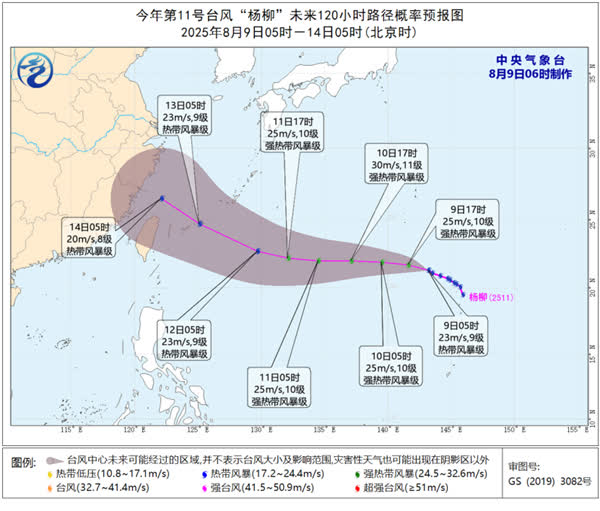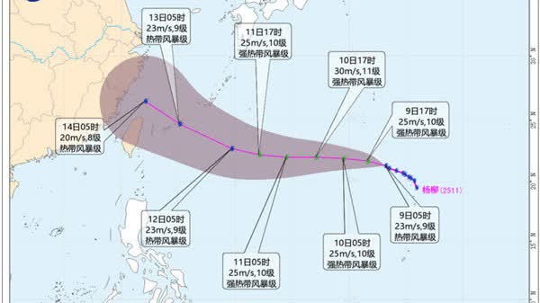 據中國天氣網消息,今年第11號颱風「楊柳」(熱帶風暴級)的中心今天(9日)早晨5點鐘位於美國關島北偏西方大約890公里的西北太平洋洋面上,就是北緯21.3度、東經143.2度,中心附近最大風力9級(23米/秒),中心最低氣壓992百帕,七級風圈半徑為120~220公里。