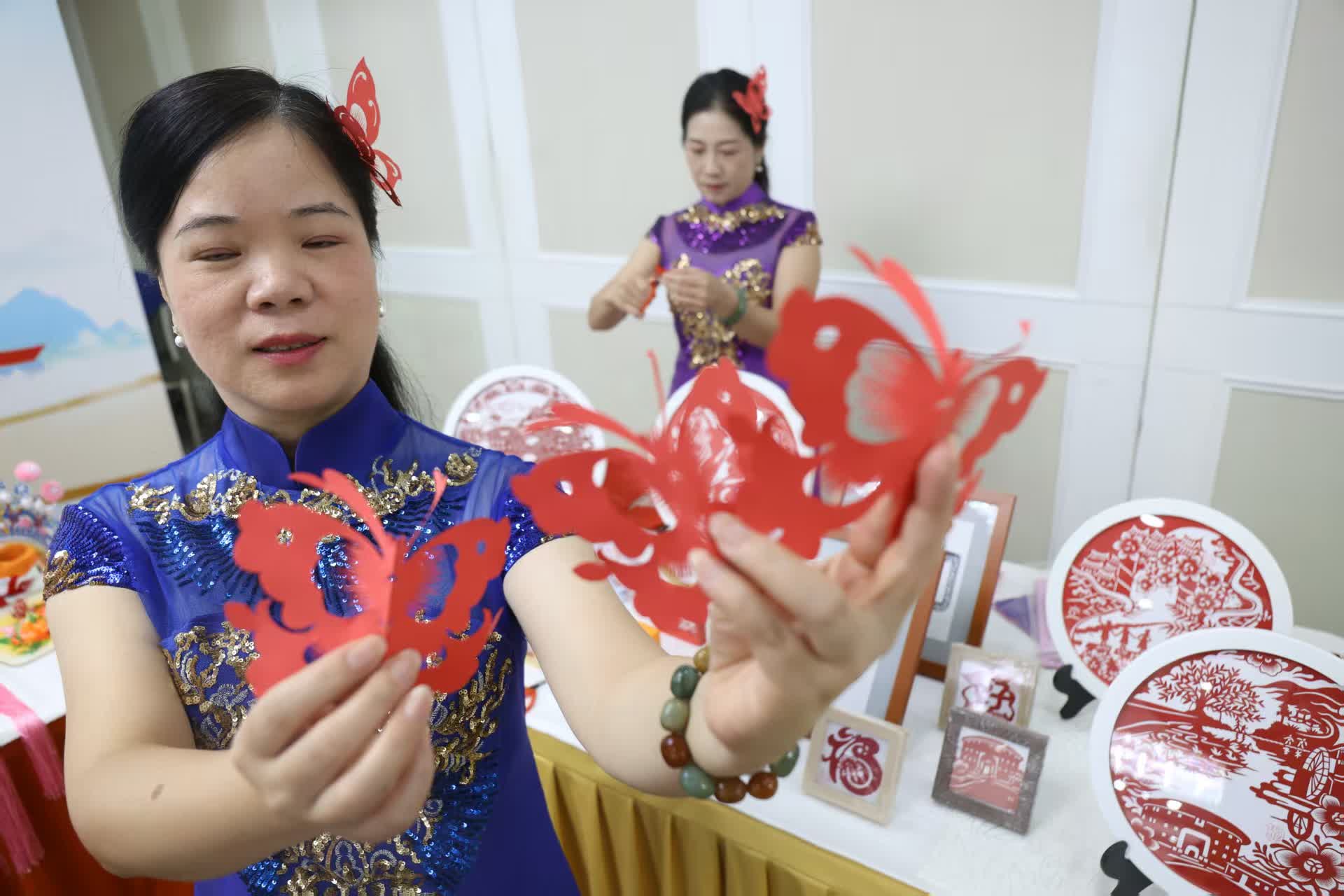 漳浦剪紙傳承人歐陽艷君表示,這是她第一次來香港,此次主要是為了展示漳浦剪紙作品。漳浦剪紙是世界級和國家級非物質文化遺產,她帶來了以土樓、青花瓷以及漳州鄉村風景為題材的作品。她表示,一幅作品從創作到剪製完成至少需要10天左右,可見剪紙頗為費時。而她本人從8歲開始接觸剪紙,12歲接受正統教育,至今已從事這一行業40餘年,這也體現了非遺傳承多從小開始的特點。