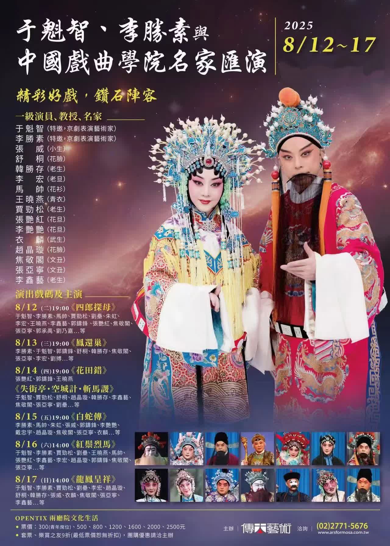 【香港大公文汇全媒体记者张宝峰北京报道】于魁智、李勝素與中國戲曲學院名家、教授一行80人,將於8月12日至17日在台北戲劇院盛大公演,帶來《四郎探母》,《鳳還巢》,《花田錯》,《失街亭·空城計·斬馬謖》,《白蛇傳》,《紅鬃烈馬》,《龍鳳呈祥》等戲迷耳熟能詳的經典好戲。