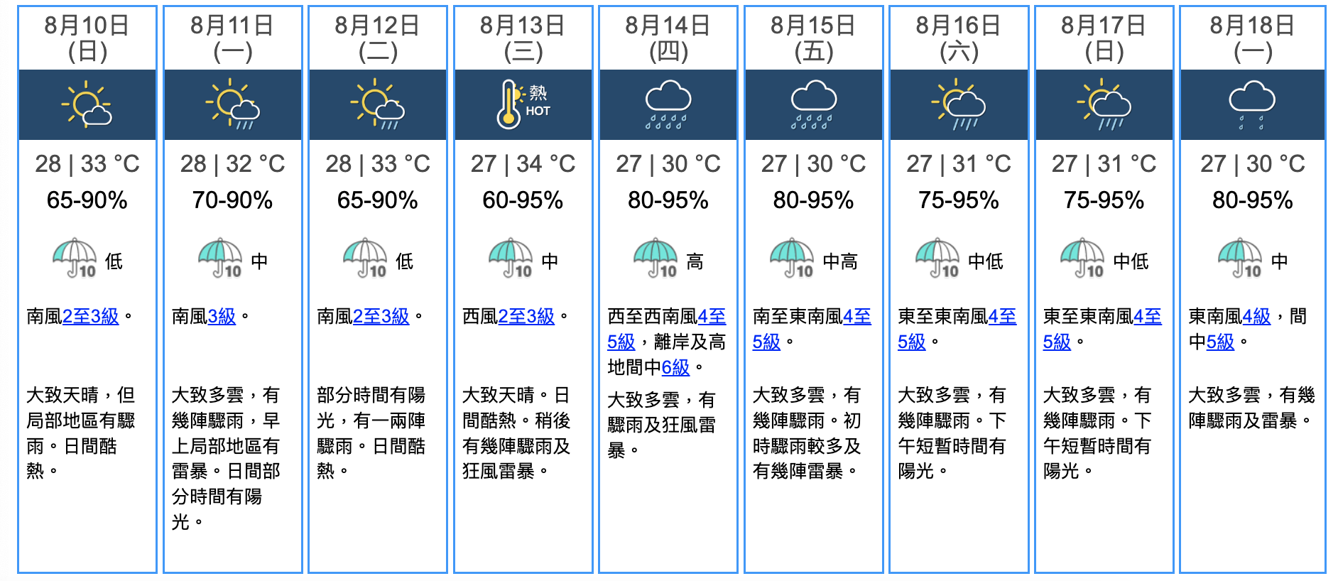 明日(10日)大致天晴,局部地區有驟雨,日間酷熱,氣溫介乎28至33度。下周四(14日)起有驟雨及狂風雷暴。