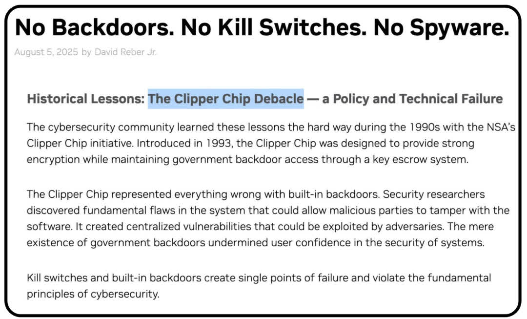 英偉達在隨後的自辯聲明中提到,芯片沒有「後門」,他們還專門提到了「Clipper芯片」事件。