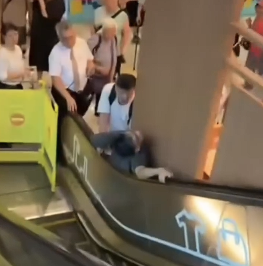網上流傳事發現場短片,可見老翁身體攝於扶手梯與餐廳圍板之間動彈不得,雙手張開苦苦支撐,多名途人嘗試營救及關心老翁狀態,涉事扶手梯已經停止運作。
