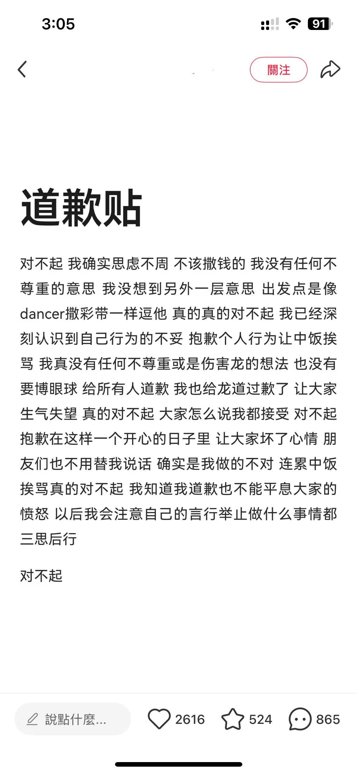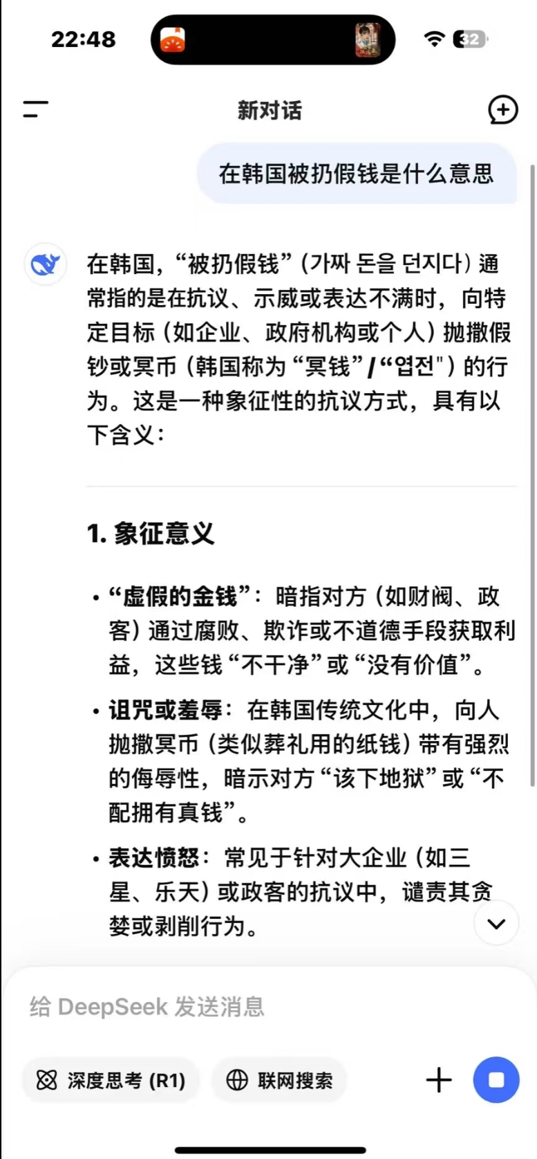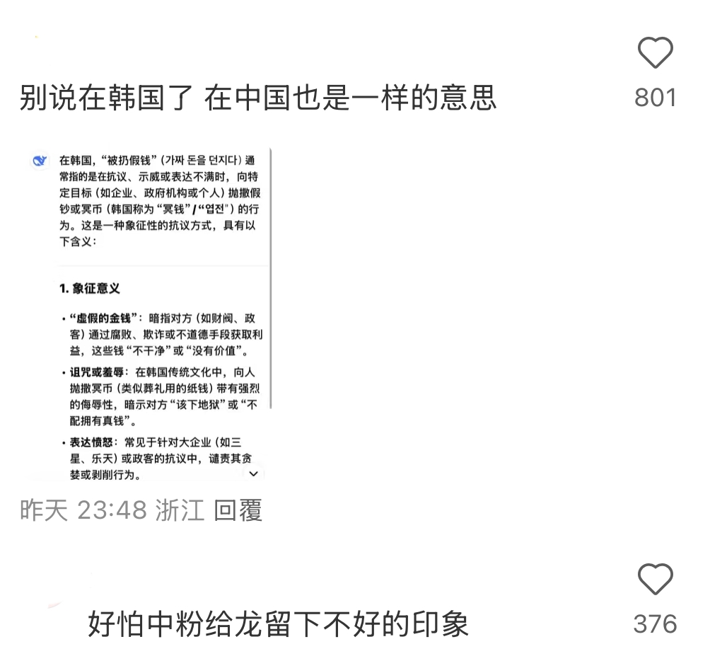 在道歉帖下,有網民帖出Deepseek頁面表示,無論是在中國還是韓國,扔假鈔都是十分侮辱人的行為。還有粉絲表示,擔心此事件令權志龍對中國粉絲的印象變差,令偶像感到失望。