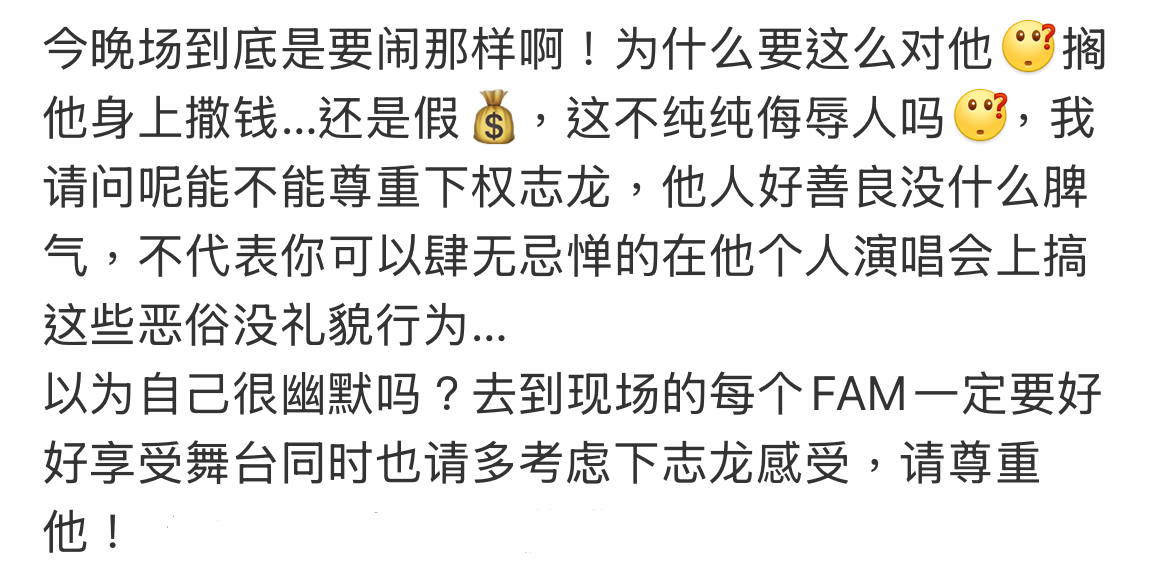然而,該道歉帖並未平息粉絲的怒火。有網民表示,「以為自己很幽默嗎?去到現場的每個FAM一定要好好享受舞台同時也請多考慮下志龍感受,請尊重他!」還有網民譴責,「是愛還是恨?到底為什麼要幹這麼丟人的事情?」