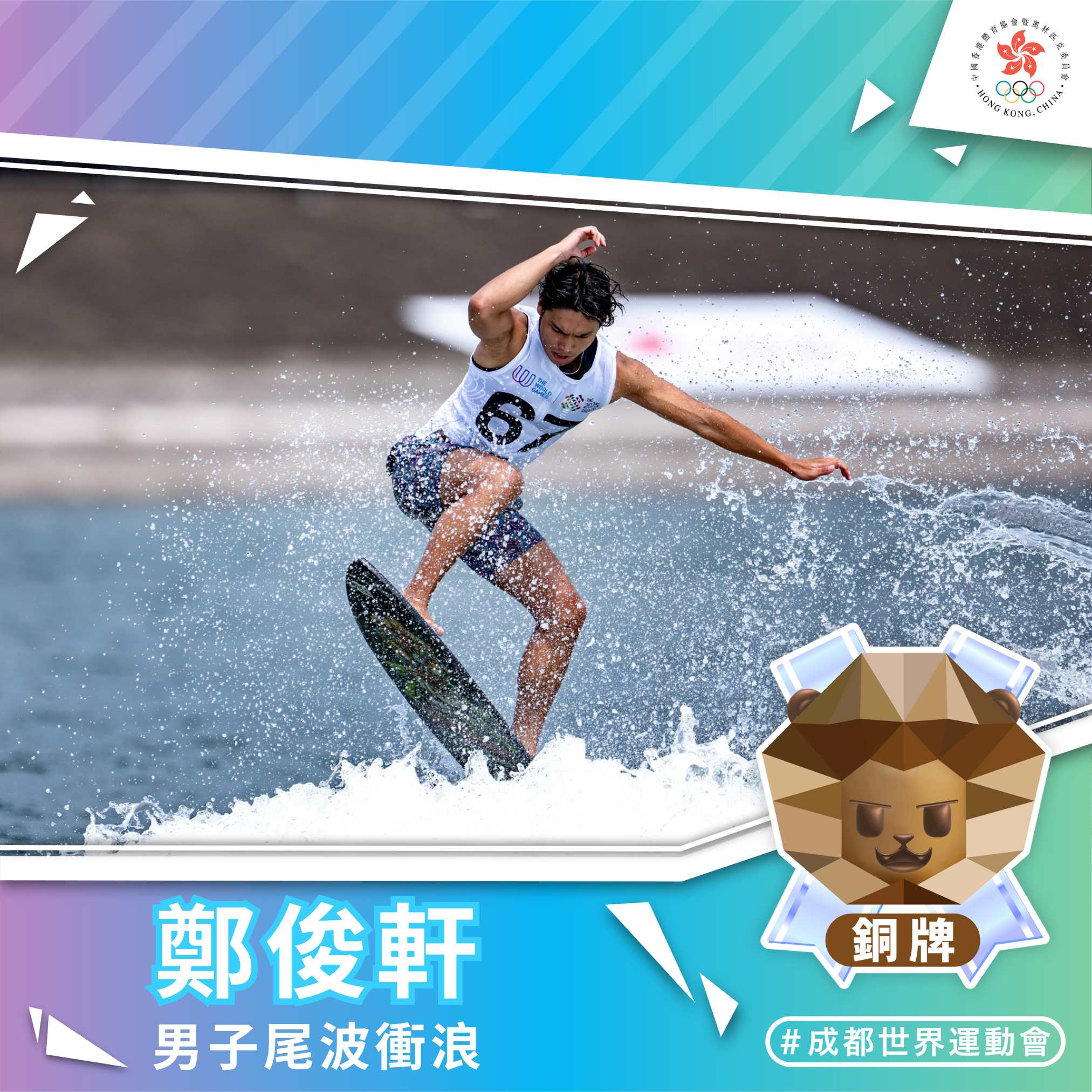 大公文匯全媒體報道,世界運動會(世運會)正在成都舉行,香港代表隊再傳捷報。沙板尾波衝浪(wakesurf skim)男子決賽今日(10日)結束,本港代表、25歲鄭俊軒以59分排名第三,為港隊奪得一面銅牌,是香港代表隊在本屆世運會摘得的第四面獎牌。