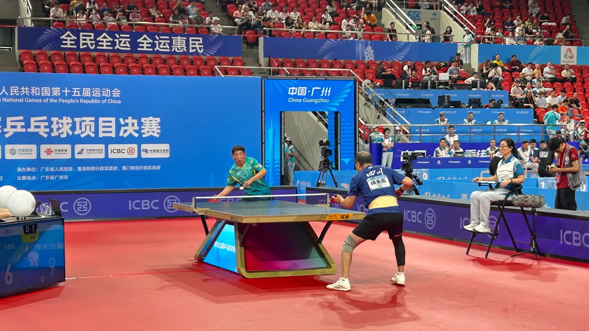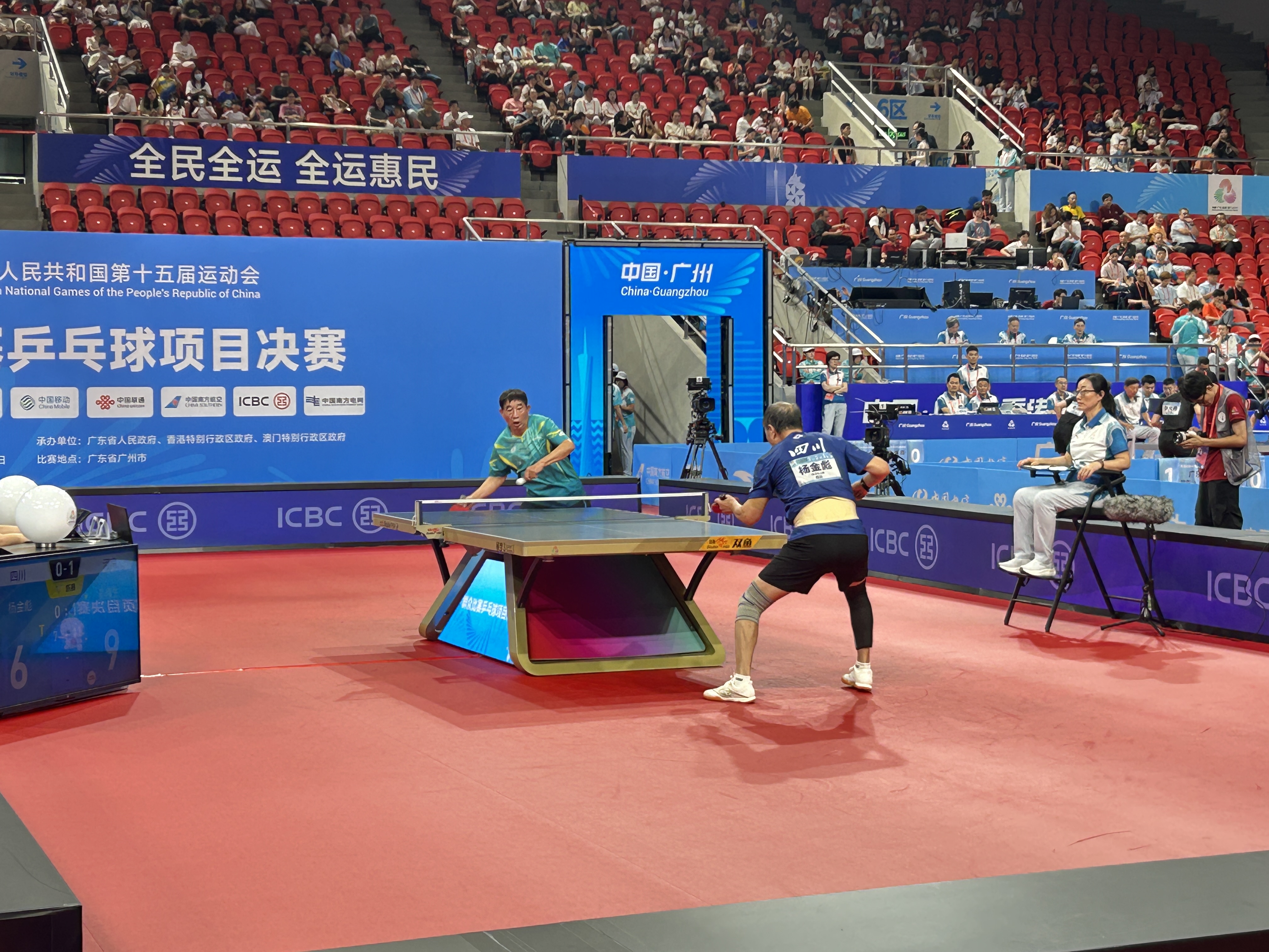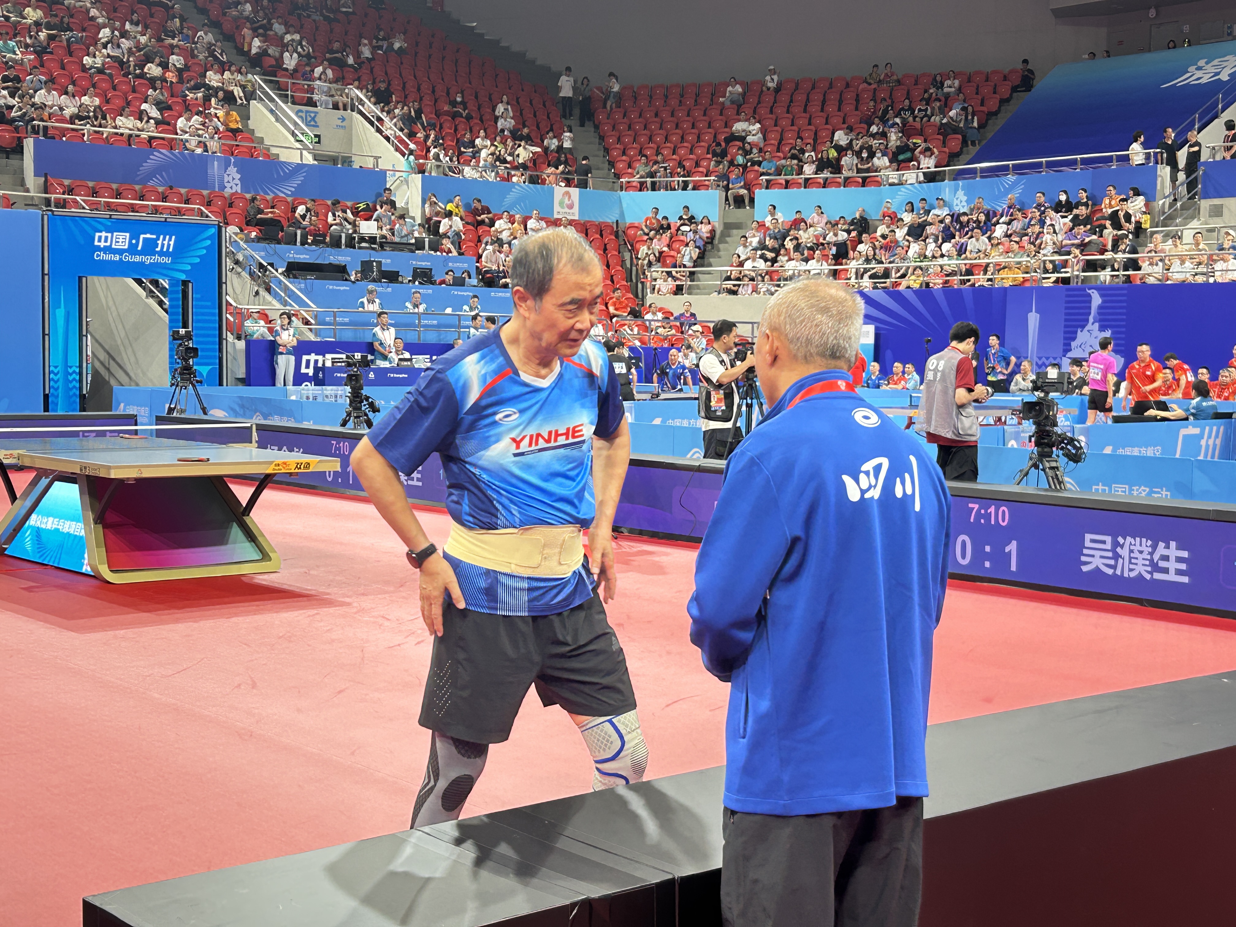 記者看到,在男子團體賽四川與江蘇隊的比賽中,四川隊74歲的老將楊金彪身形矯健,儘管帶傷出戰不得不在腰上綁着束縛帶,他仍力拚到底,扣殺凌厲,最終取得了關鍵一分,使得四川隊勝利晉級。
