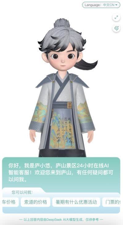 活動中,廬山文旅帶來了AI數字推介官,介紹「一機遊廬山」智慧服務平台。該平台由廬山文控數字科技公司自主研發,以「科技+文旅」為核心理念,通過DeepSeek國產大模型技術實現信息實時精準匹配。平台核心功能涵蓋遊客服務全流程:古風AI數字虛擬人「廬小悠」24小時在線解答門票、交通、景點問題,延伸推薦親子路線與詩詞典故;支持「AI一鍵購票」整合門票、索道等票種,嚴選「近景區」「親子友好」酒店並打造套餐;對接「廬景通」服務實現景點間即時打車,推薦明碼標價的優質講解員。